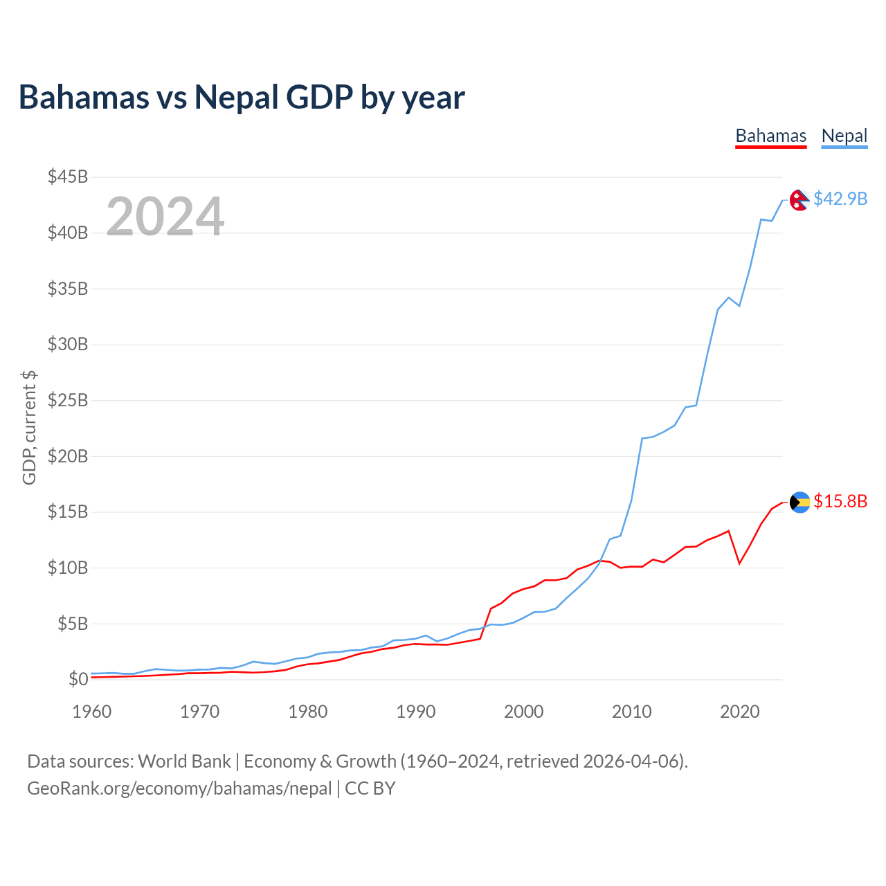 The Bahamas has a GDP of $15.8B compared to $42.9B for Nepal, ranking 140/197 and 101/197 by economy size, respectively.