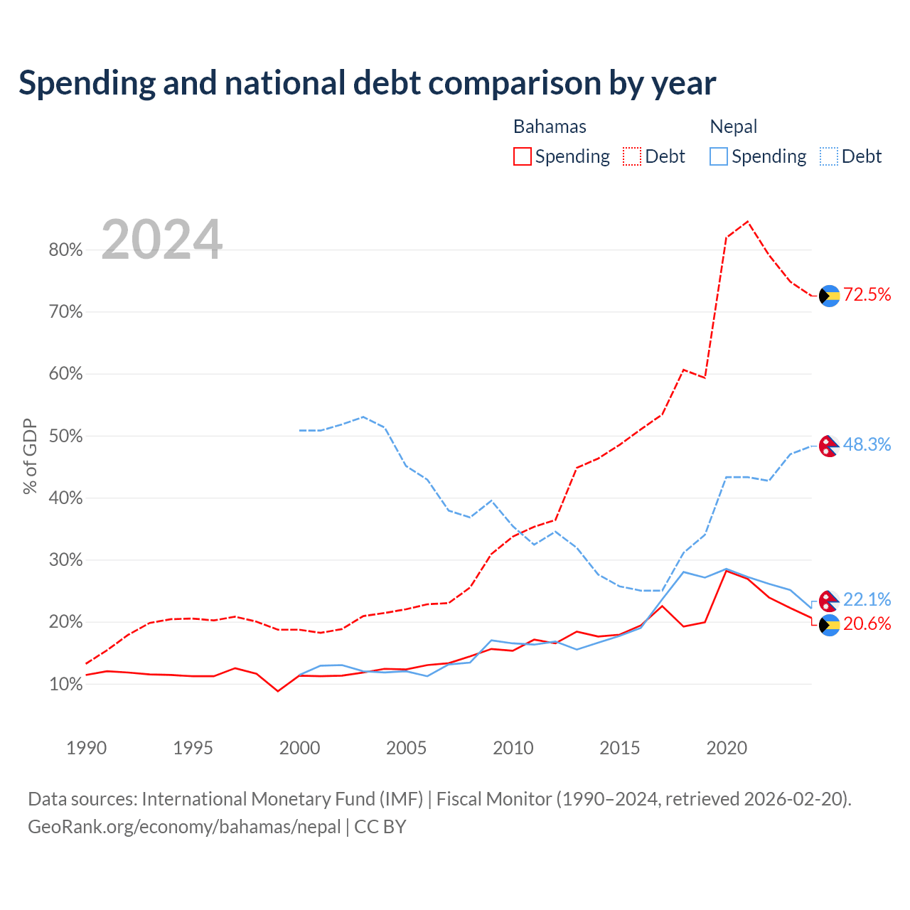 The Bahamas has $11.5B in government debt (72.5% of GDP), compared to $20.7B (48.3% of GDP) in Nepal.