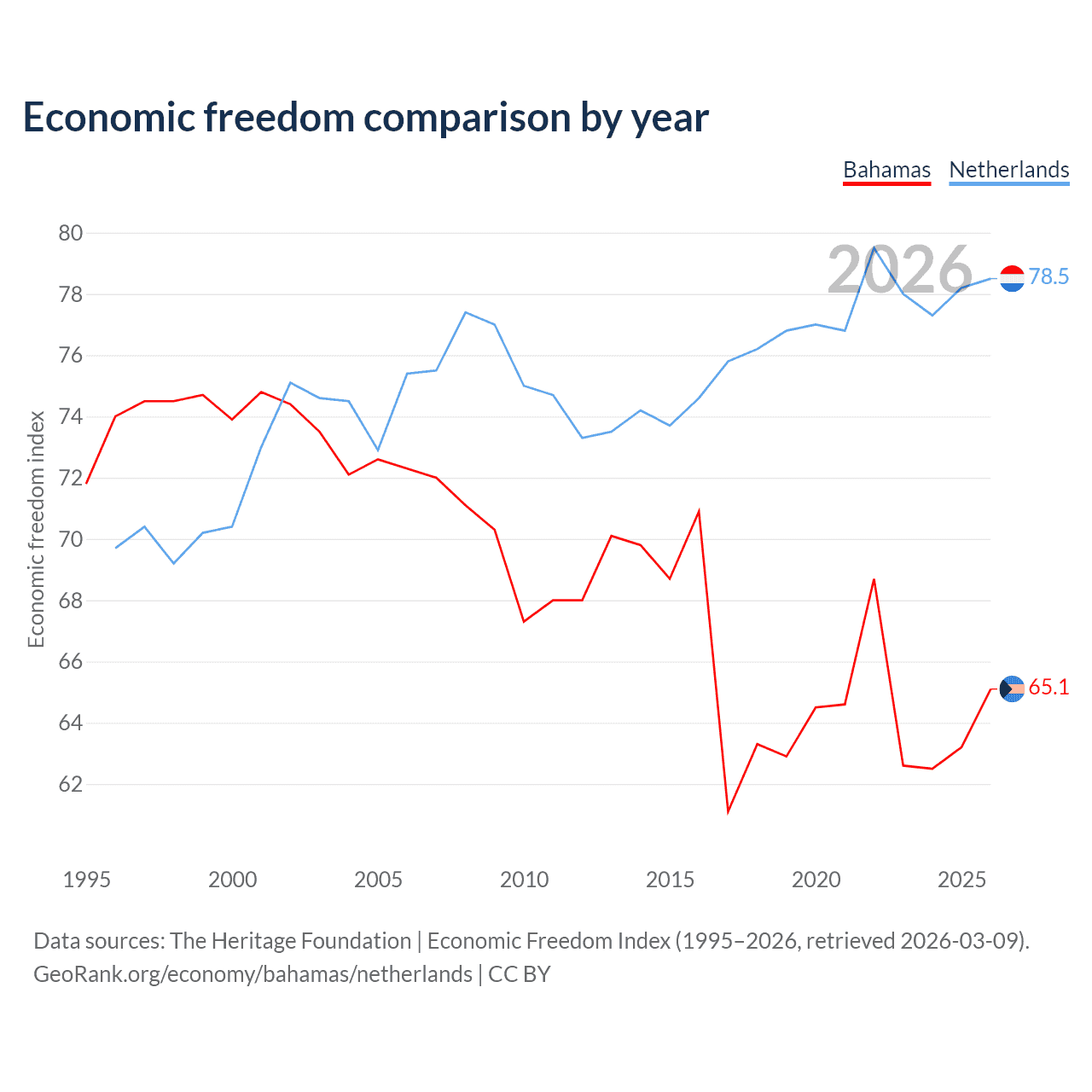 The Economic Freedom Index for the Bahamas is 65.1, ranking 66/197, compared to 78.5 for the Netherlands, ranking 11/197. The chart above displays a comparison of annual changes in economic freedom indexes.