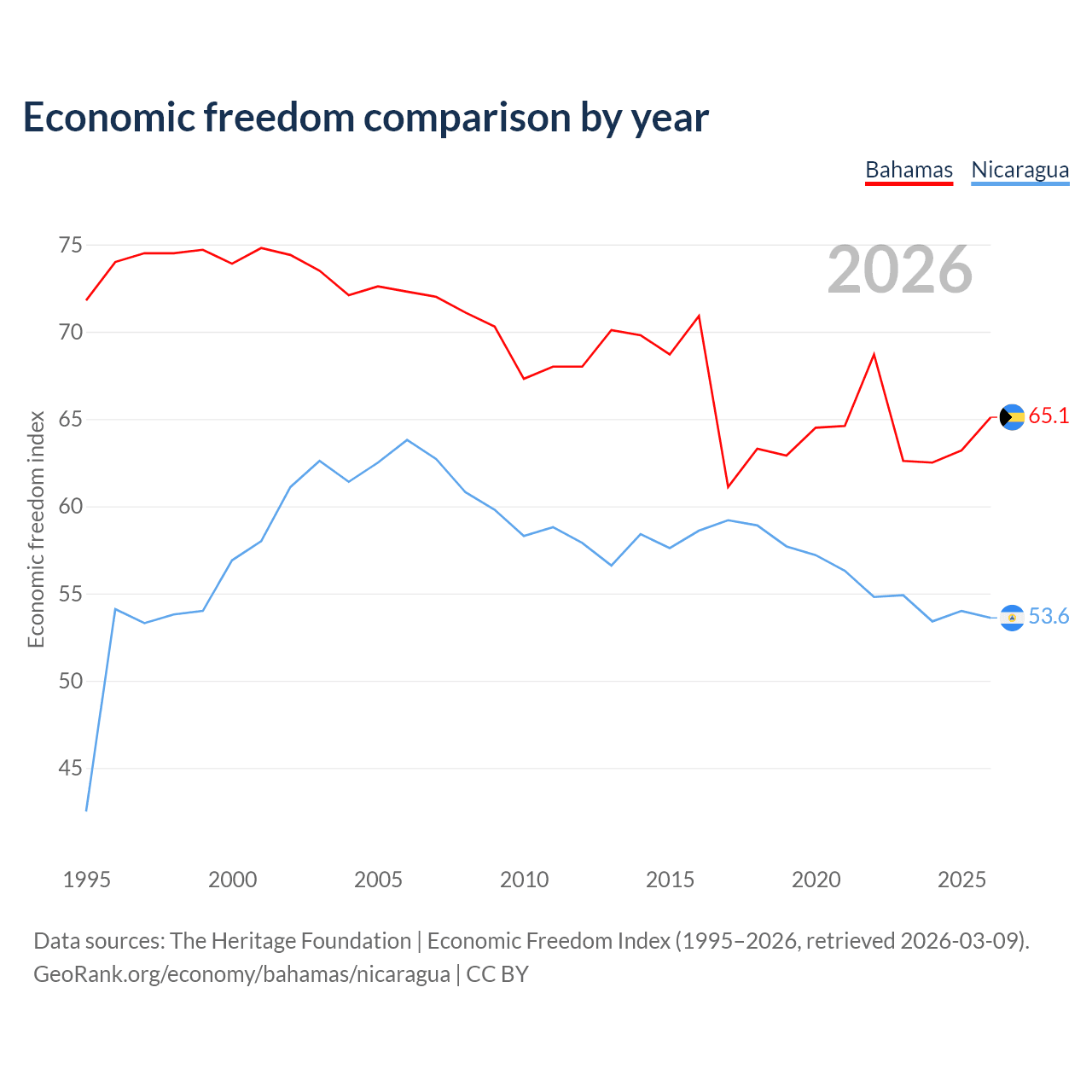 The Economic Freedom Index for the Bahamas is 65.1, ranking 66/197, compared to 53.6 for Nicaragua, ranking 139/197. The chart above displays a comparison of annual changes in economic freedom indexes.