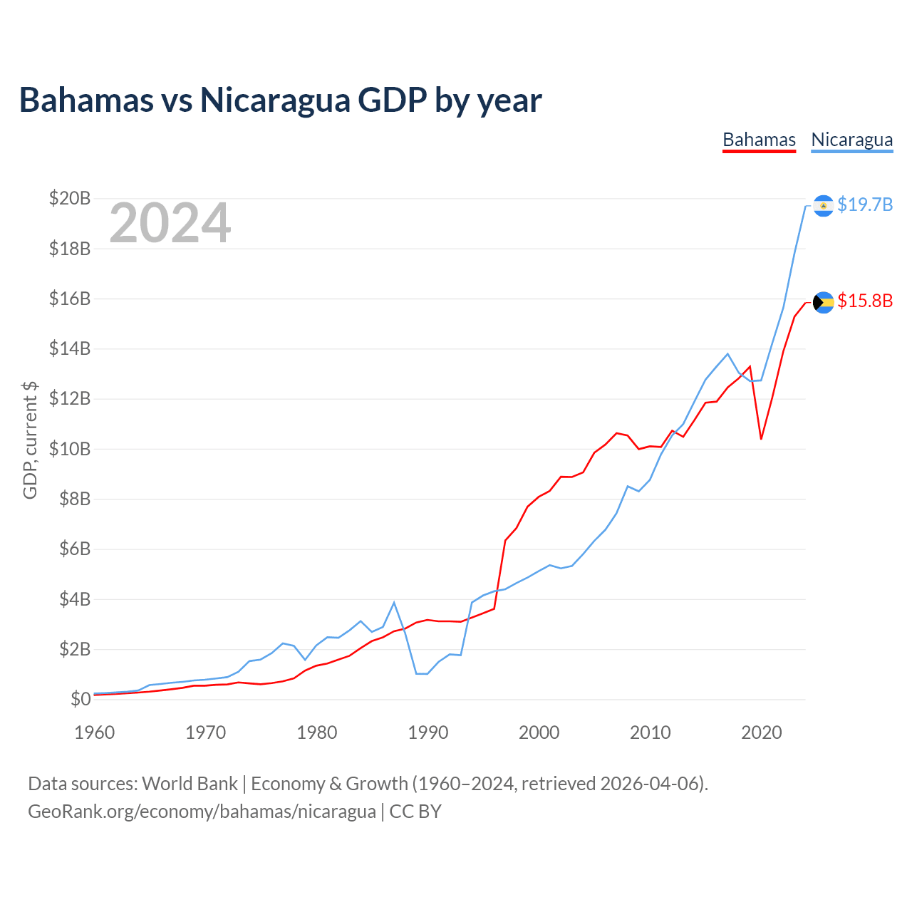 The Bahamas has a GDP of $15.8B compared to $19.7B for Nicaragua, ranking 140/197 and 131/197 by economy size, respectively.