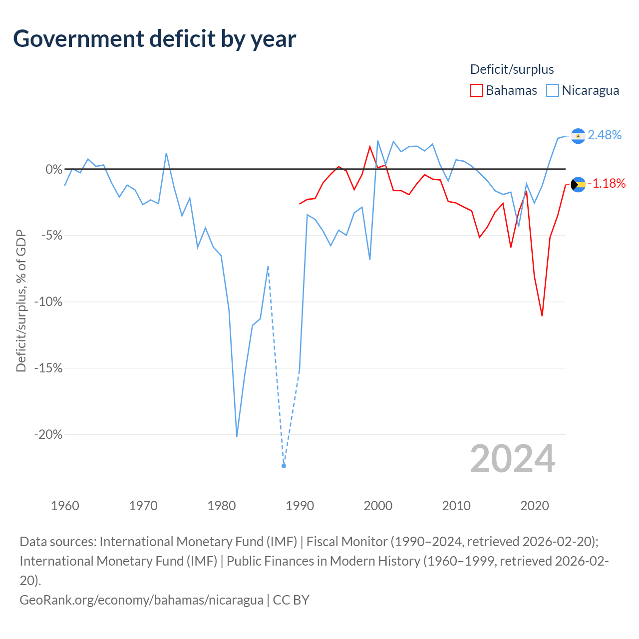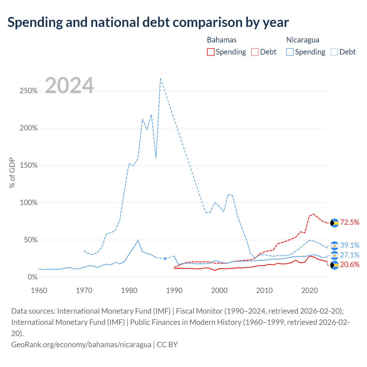 The Bahamas has $11.5B in government debt (72.5% of GDP), compared to $7.71B (39.1% of GDP) in Nicaragua.