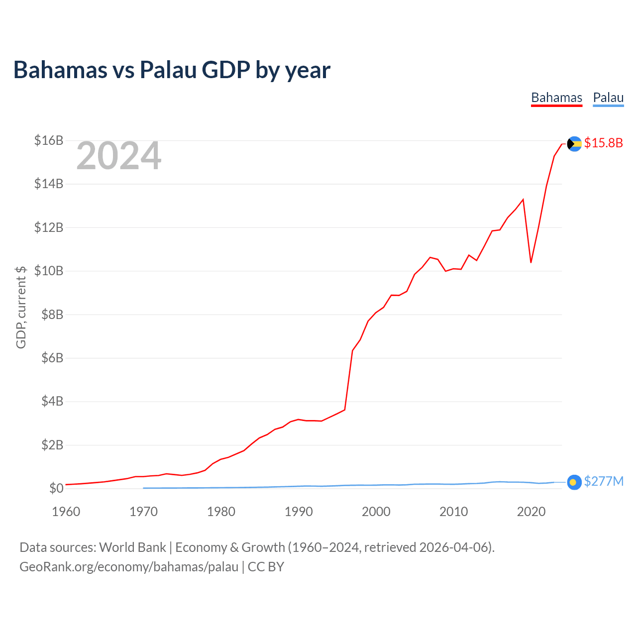The Bahamas has a GDP of $15.8B compared to $277M for Palau, ranking 140/197 and 194/197 by economy size, respectively.