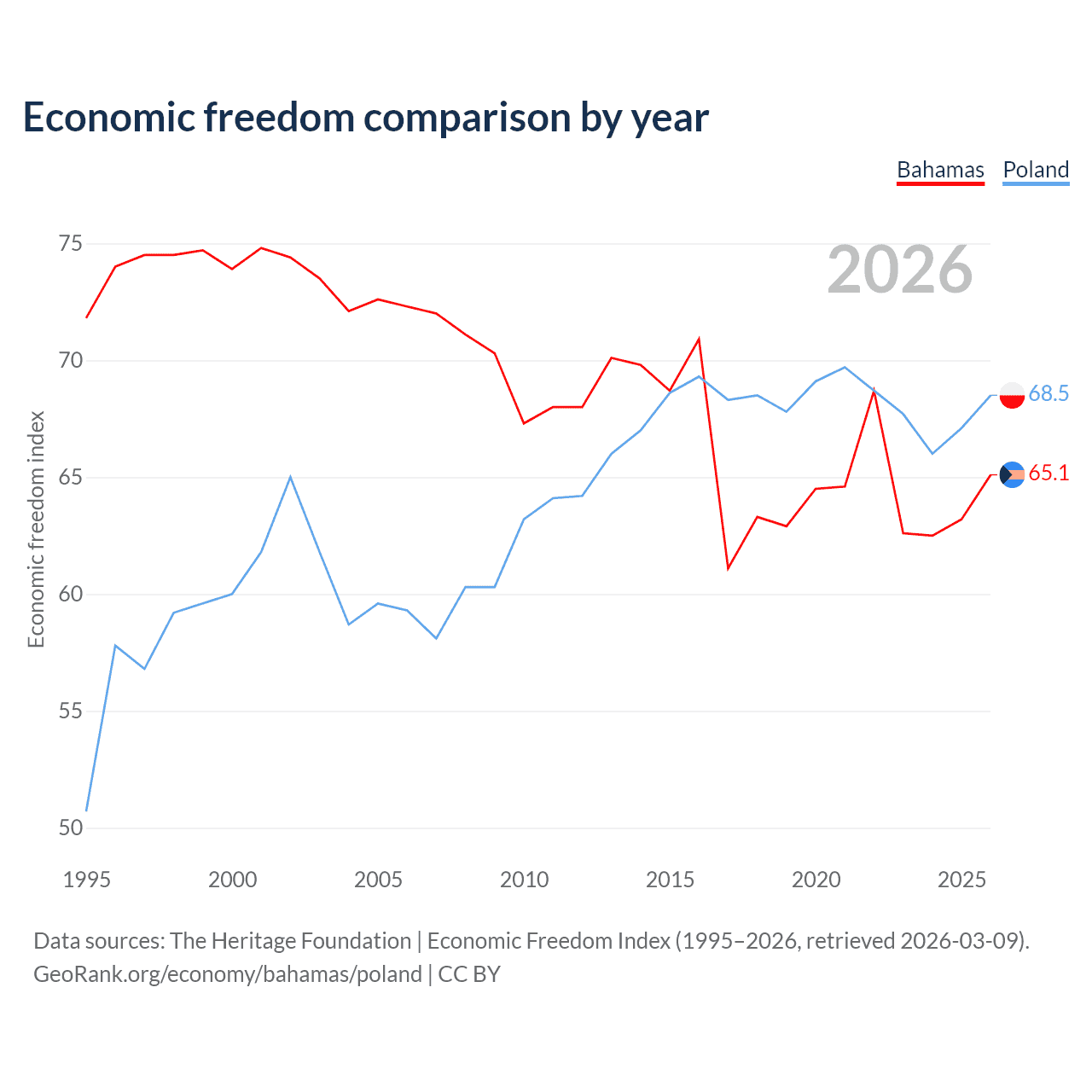 The Economic Freedom Index for the Bahamas is 65.1, ranking 66/197, compared to 68.5 for Poland, ranking 46/197. The chart above displays a comparison of annual changes in economic freedom indexes.