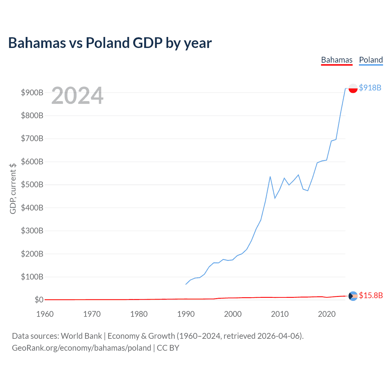 The Bahamas has a GDP of $15.8B compared to $918B for Poland, ranking 140/197 and 21/197 by economy size, respectively.