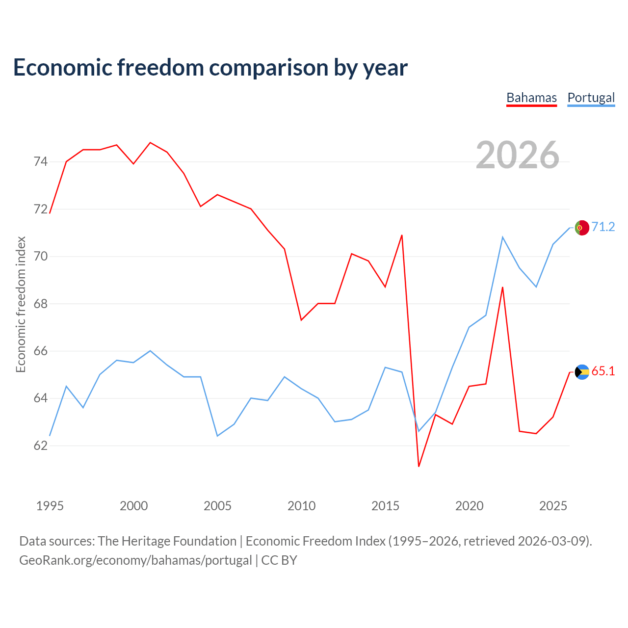 The Economic Freedom Index for the Bahamas is 65.1, ranking 66/197, compared to 71.2 for Portugal, ranking 33/197. The chart above displays a comparison of annual changes in economic freedom indexes.