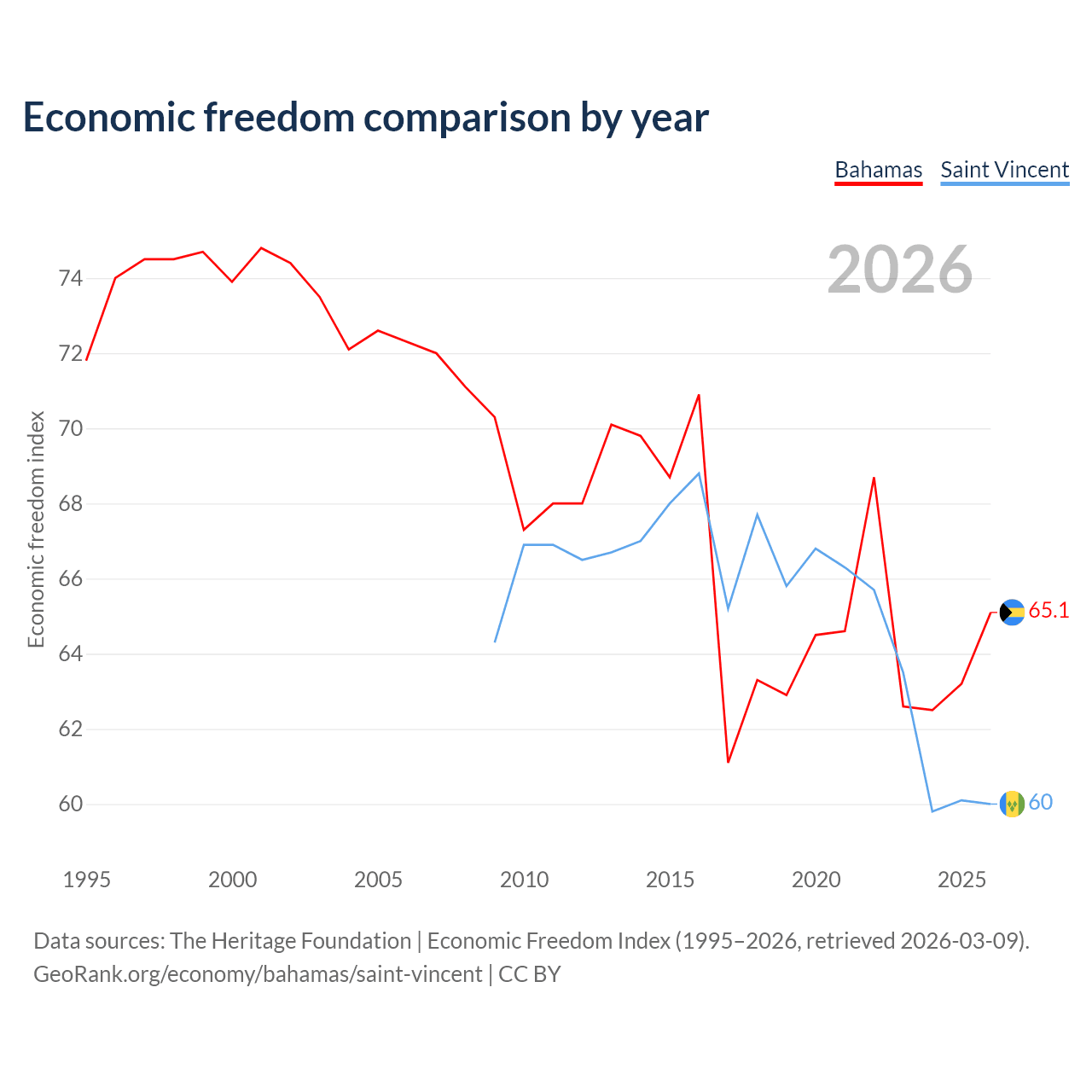 The Economic Freedom Index for the Bahamas is 65.1, ranking 66/197, compared to 60 for Saint Vincent, ranking 98/197. The chart above displays a comparison of annual changes in economic freedom indexes.