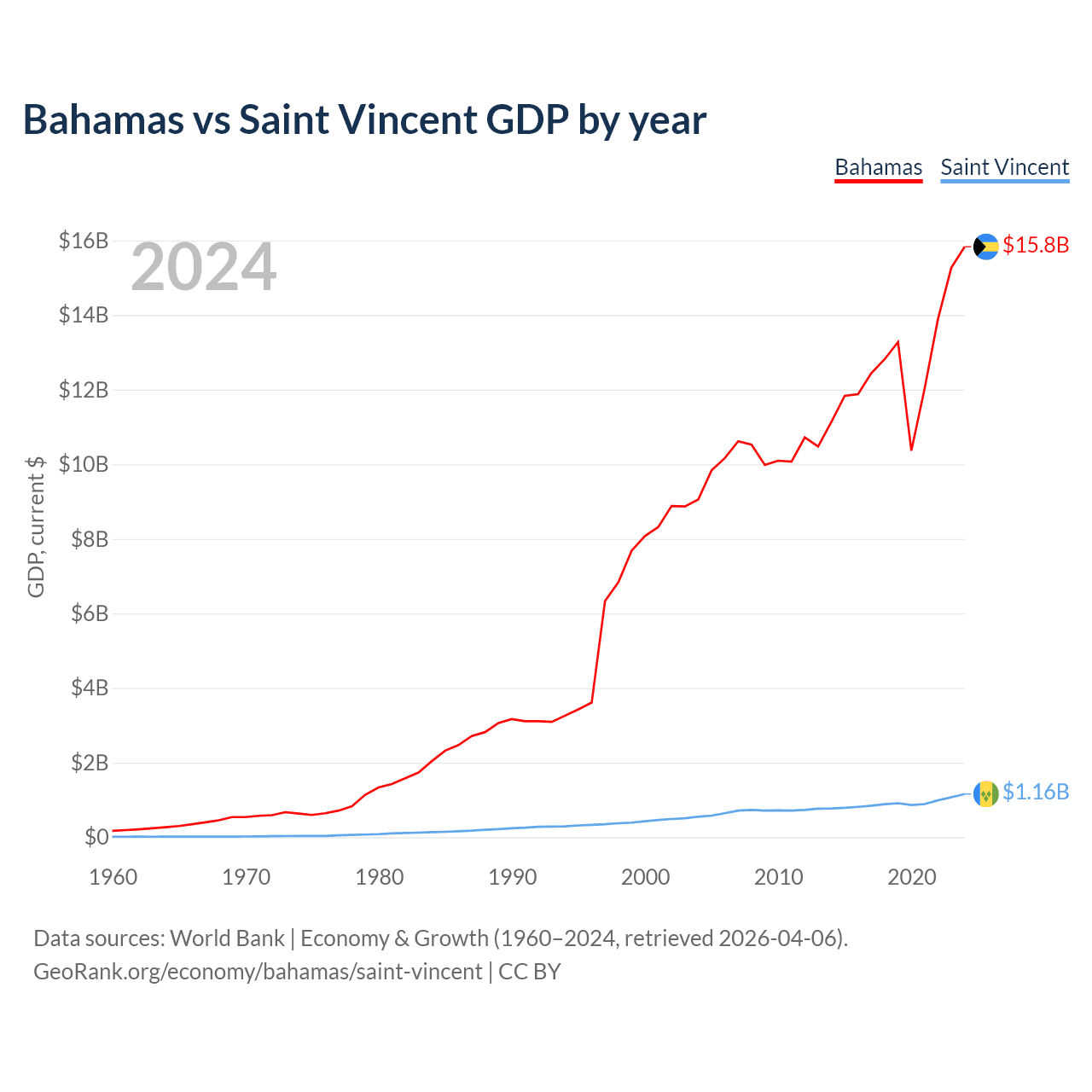 The Bahamas has a GDP of $15.8B compared to $1.16B for Saint Vincent, ranking 140/197 and 186/197 by economy size, respectively.