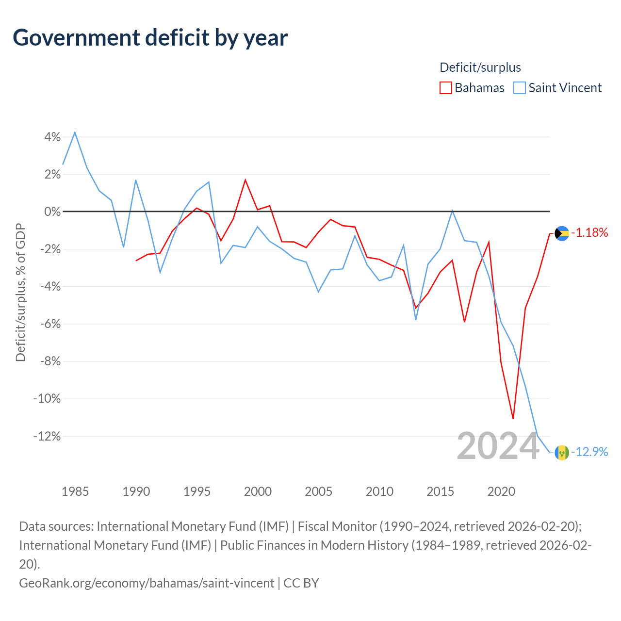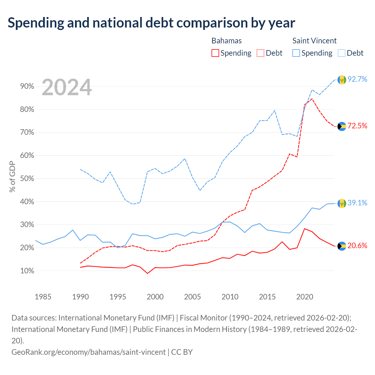 The Bahamas has $11.5B in government debt (72.5% of GDP), compared to $1.07B (92.7% of GDP) in Saint Vincent.
