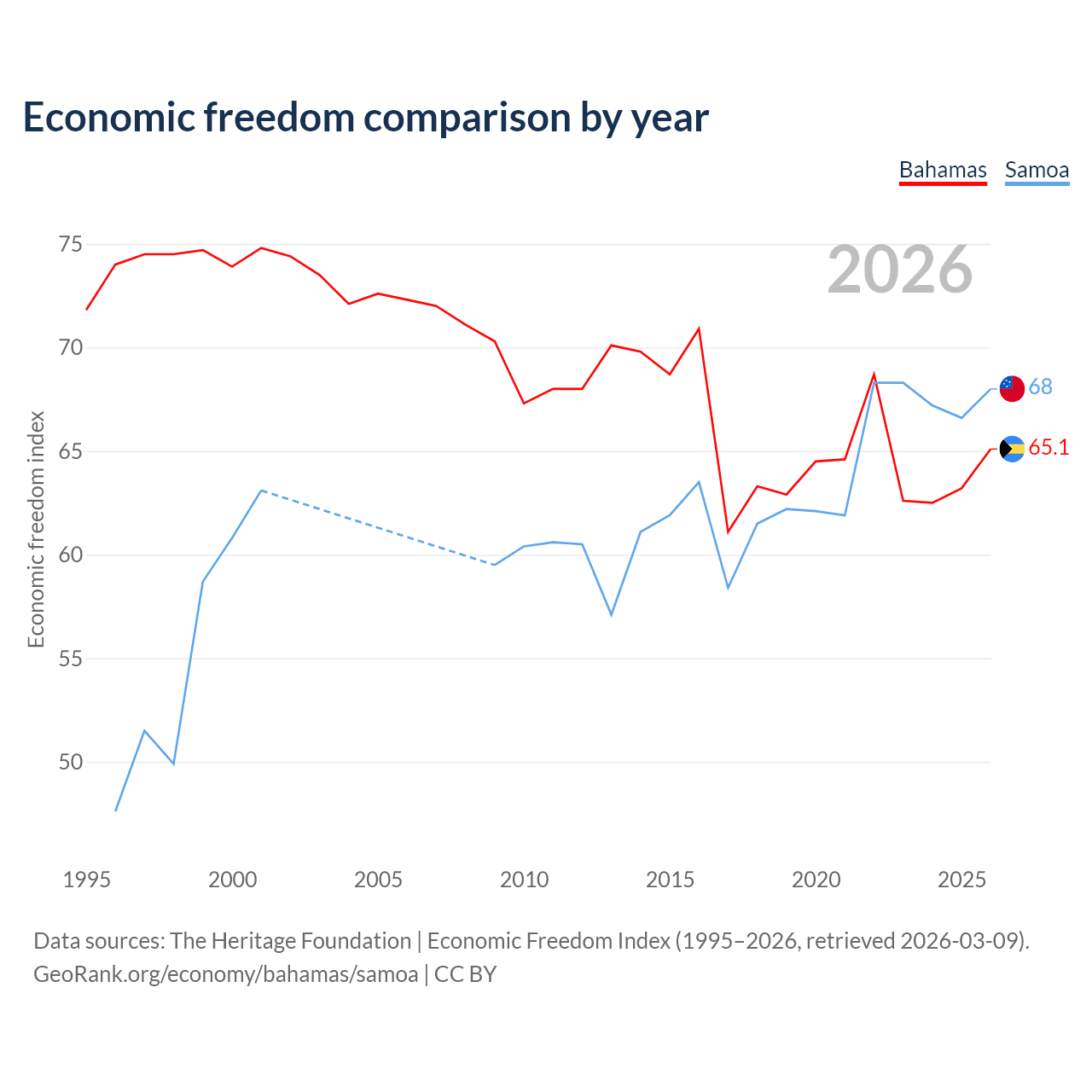 The Economic Freedom Index for the Bahamas is 65.1, ranking 66/197, compared to 68 for Samoa, ranking 52/197. The chart above displays a comparison of annual changes in economic freedom indexes.