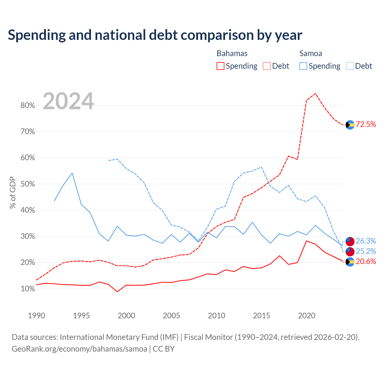 The Bahamas has $11.5B in government debt (72.5% of GDP), compared to $296M (25.2% of GDP) in Samoa.