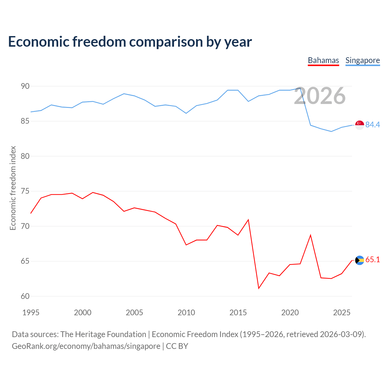 The Economic Freedom Index for the Bahamas is 65.1, ranking 66/197, compared to 84.4 for Singapore, ranking 1/197. The chart above displays a comparison of annual changes in economic freedom indexes.