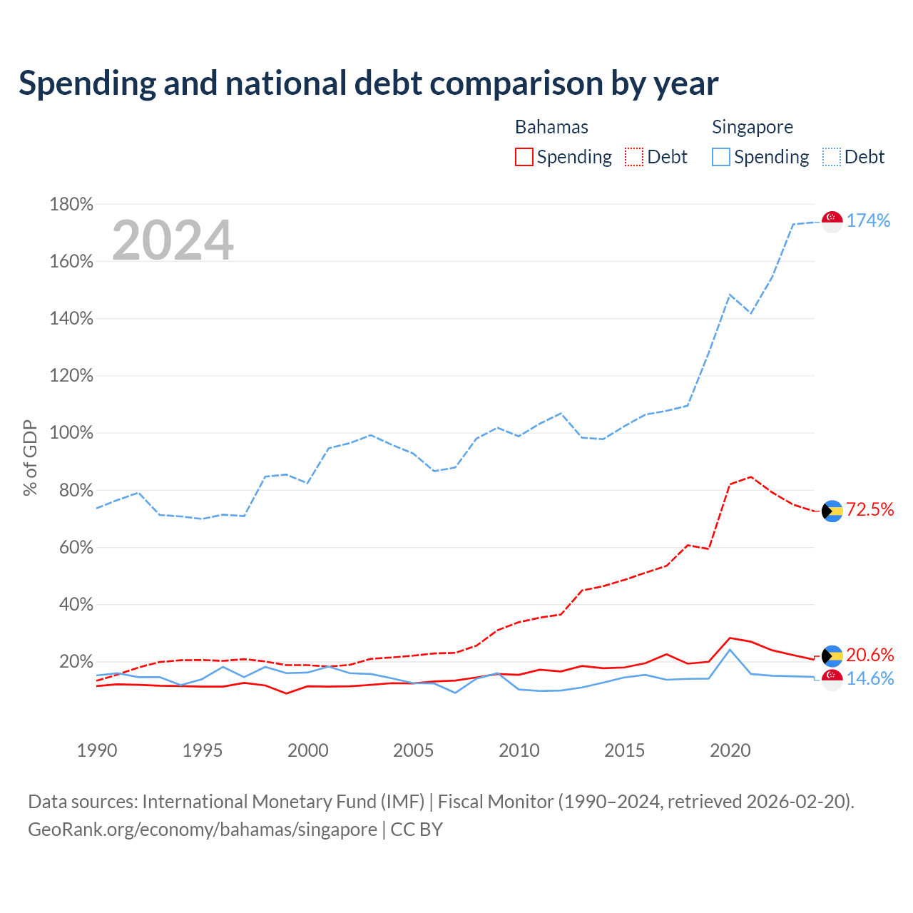The Bahamas has $11.5B in government debt (72.5% of GDP), compared to $950B (173.5% of GDP) in Singapore.