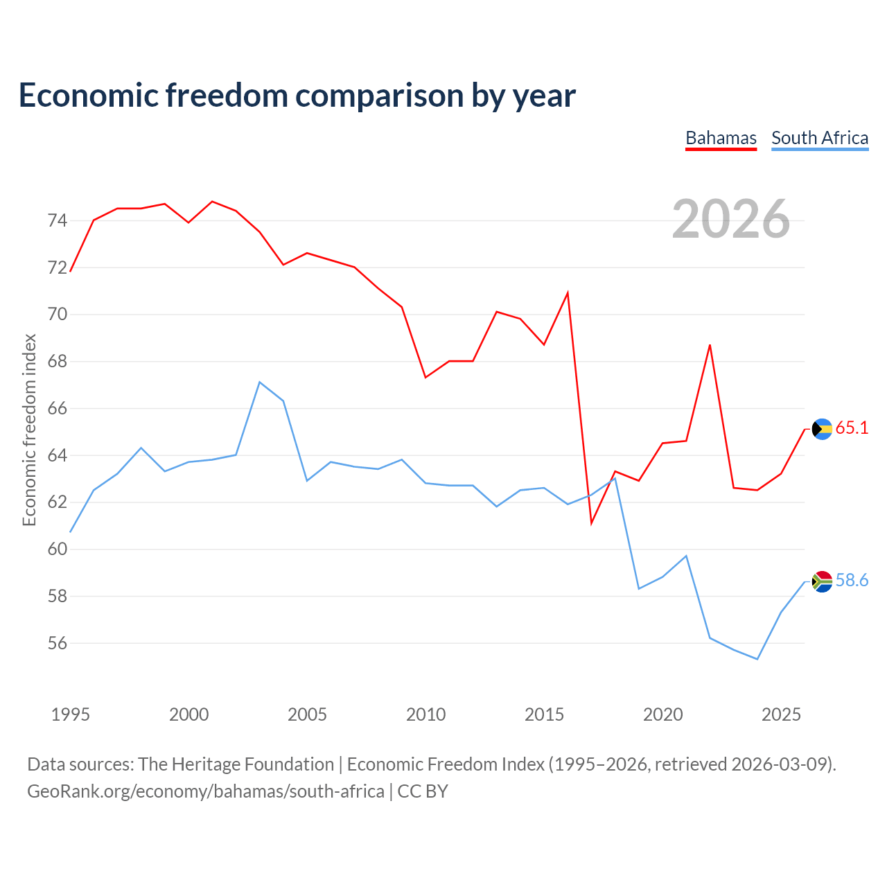 The Economic Freedom Index for the Bahamas is 65.1, ranking 66/197, compared to 58.6 for South Africa, ranking 110/197. The chart above displays a comparison of annual changes in economic freedom indexes.
