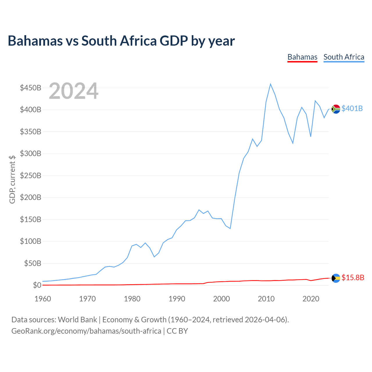 The Bahamas has a GDP of $15.8B compared to $401B for South Africa, ranking 140/197 and 40/197 by economy size, respectively.