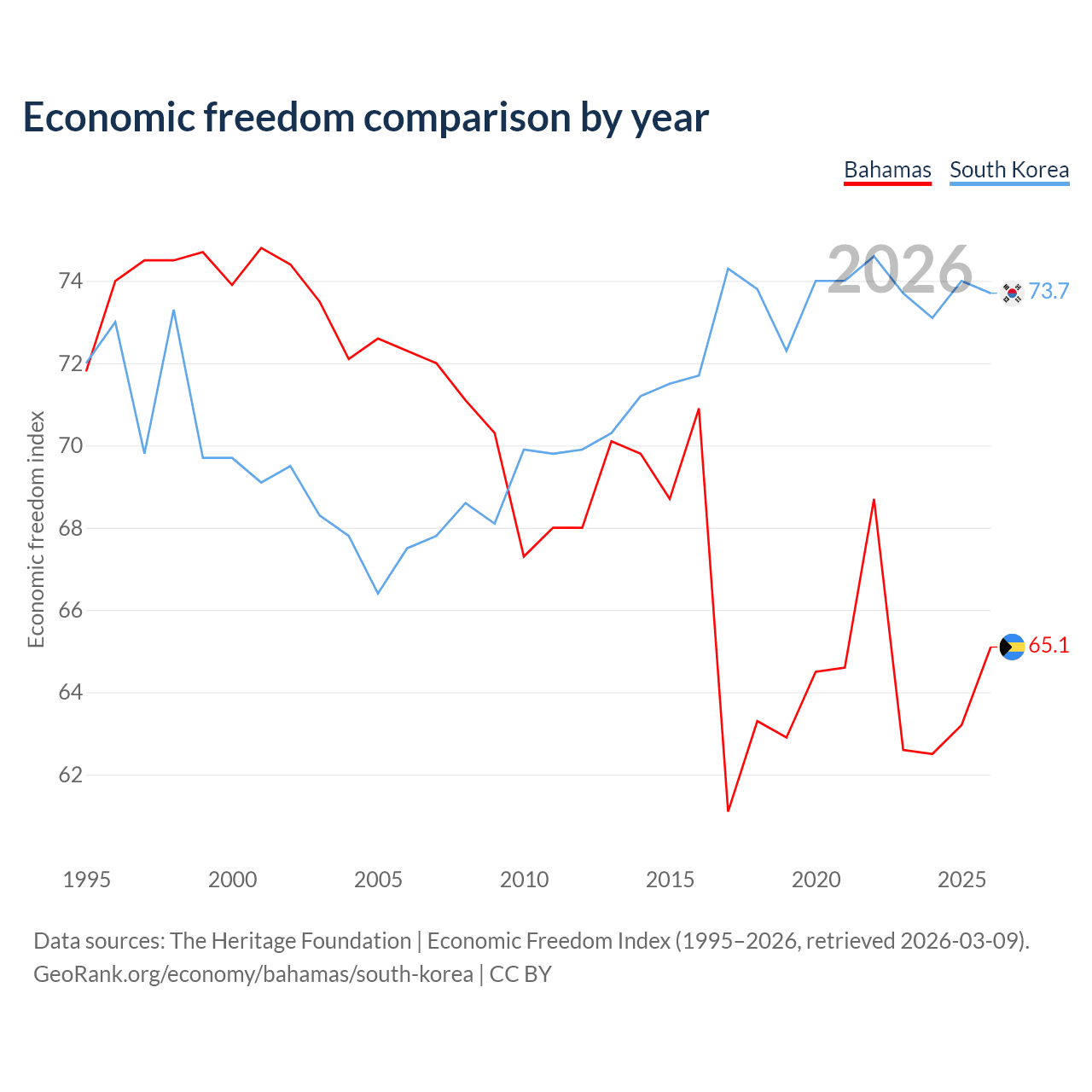The Economic Freedom Index for the Bahamas is 65.1, ranking 66/197, compared to 73.7 for South Korea, ranking 24/197. The chart above displays a comparison of annual changes in economic freedom indexes.