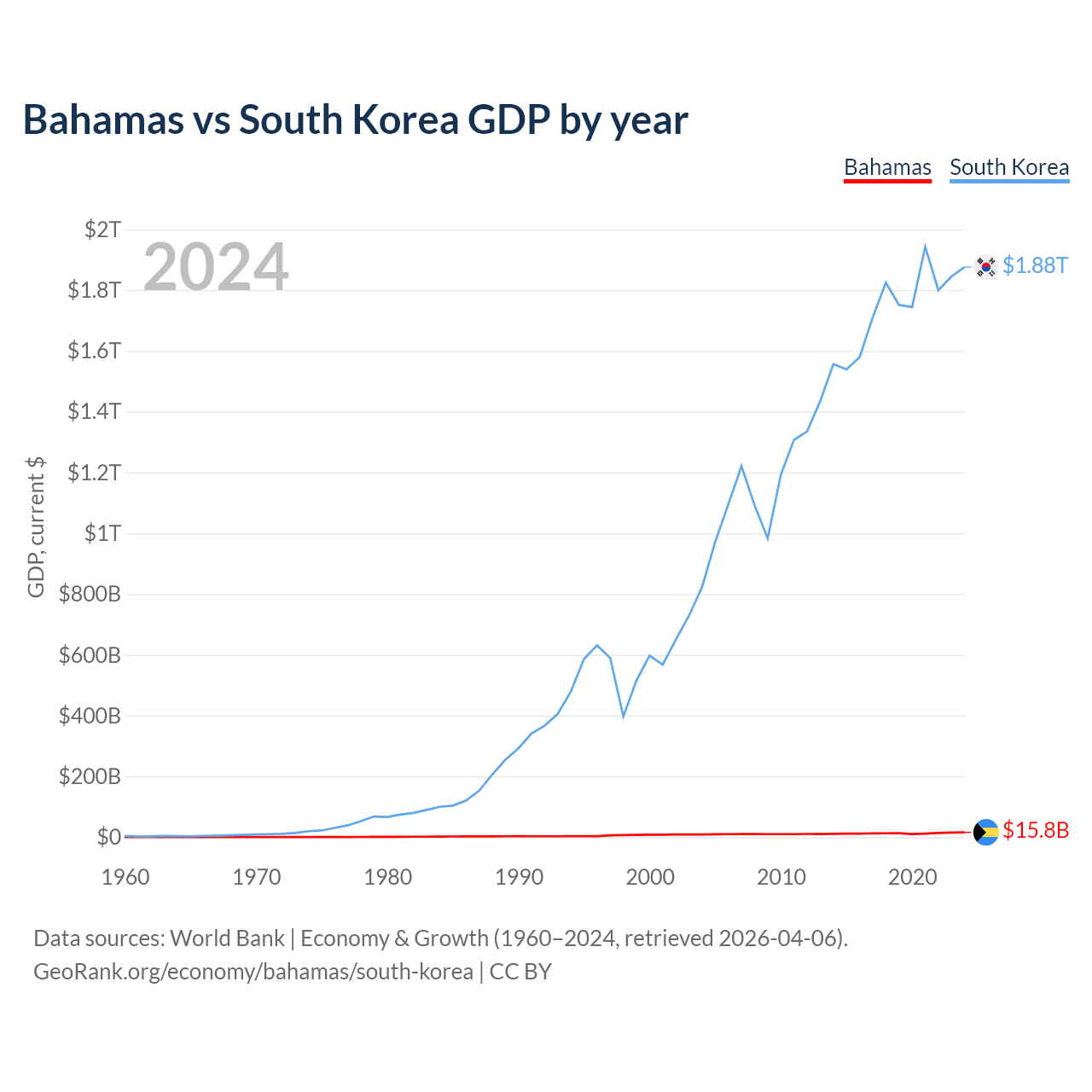 The Bahamas has a GDP of $15.8B compared to $1.88T for South Korea, ranking 140/197 and 12/197 by economy size, respectively.