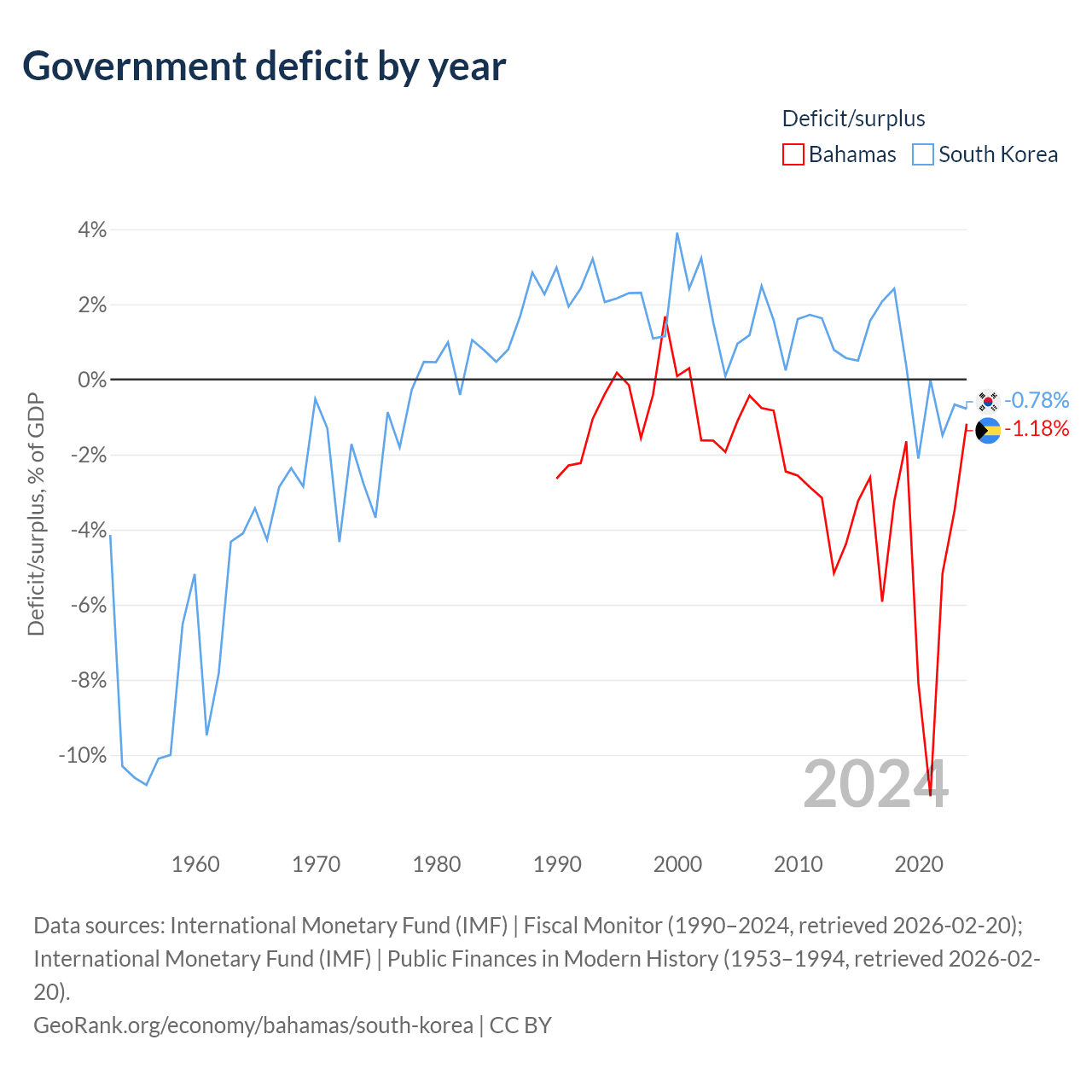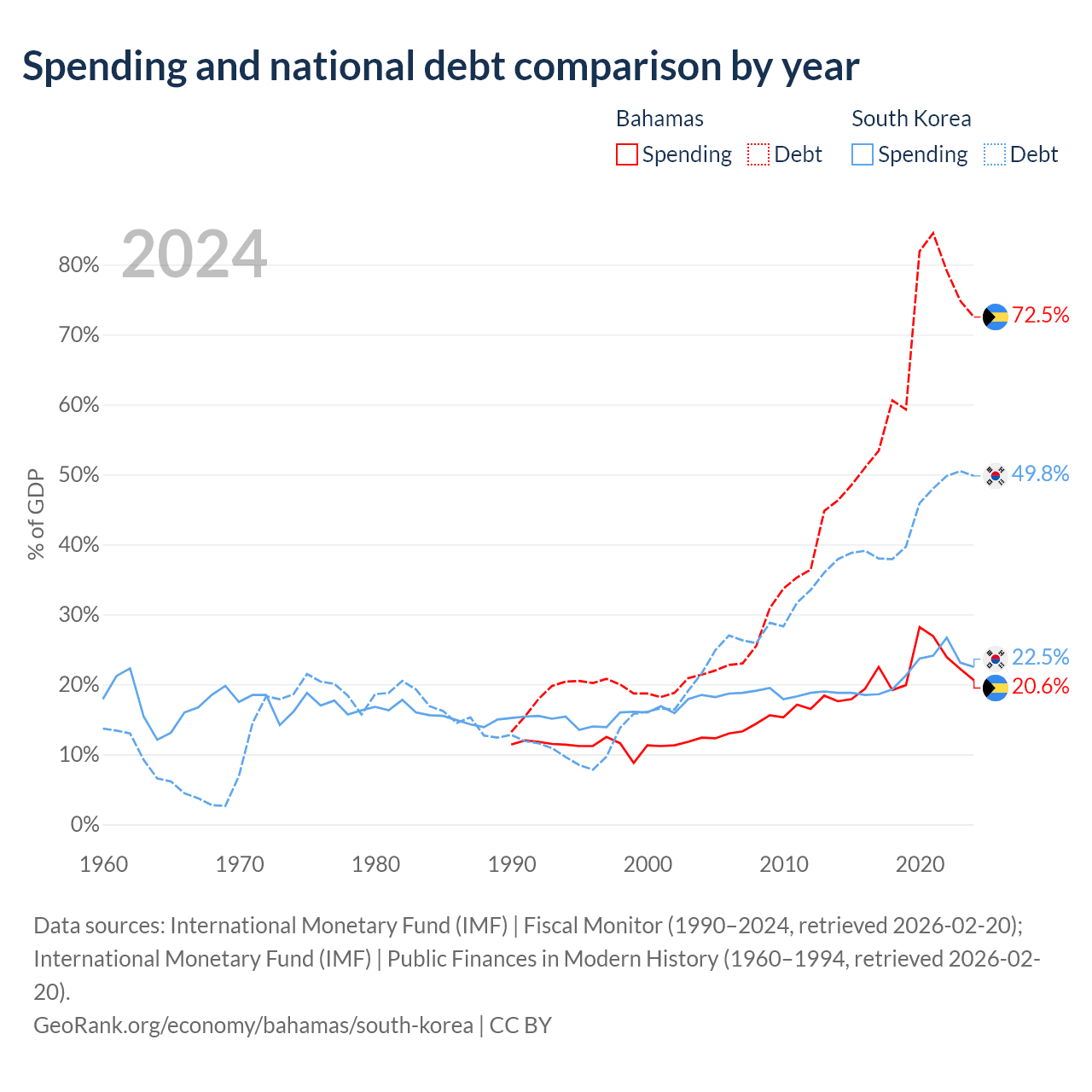 The Bahamas has $11.5B in government debt (72.5% of GDP), compared to $934B (49.8% of GDP) in South Korea.