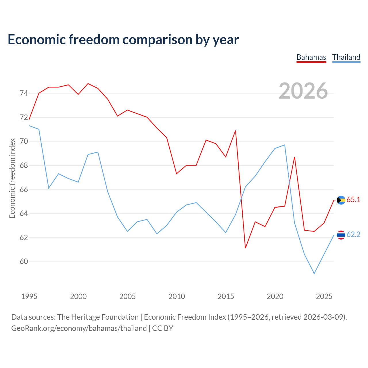 The Economic Freedom Index for the Bahamas is 65.1, ranking 66/197, compared to 62.2 for Thailand, ranking 88/197. The chart above displays a comparison of annual changes in economic freedom indexes.