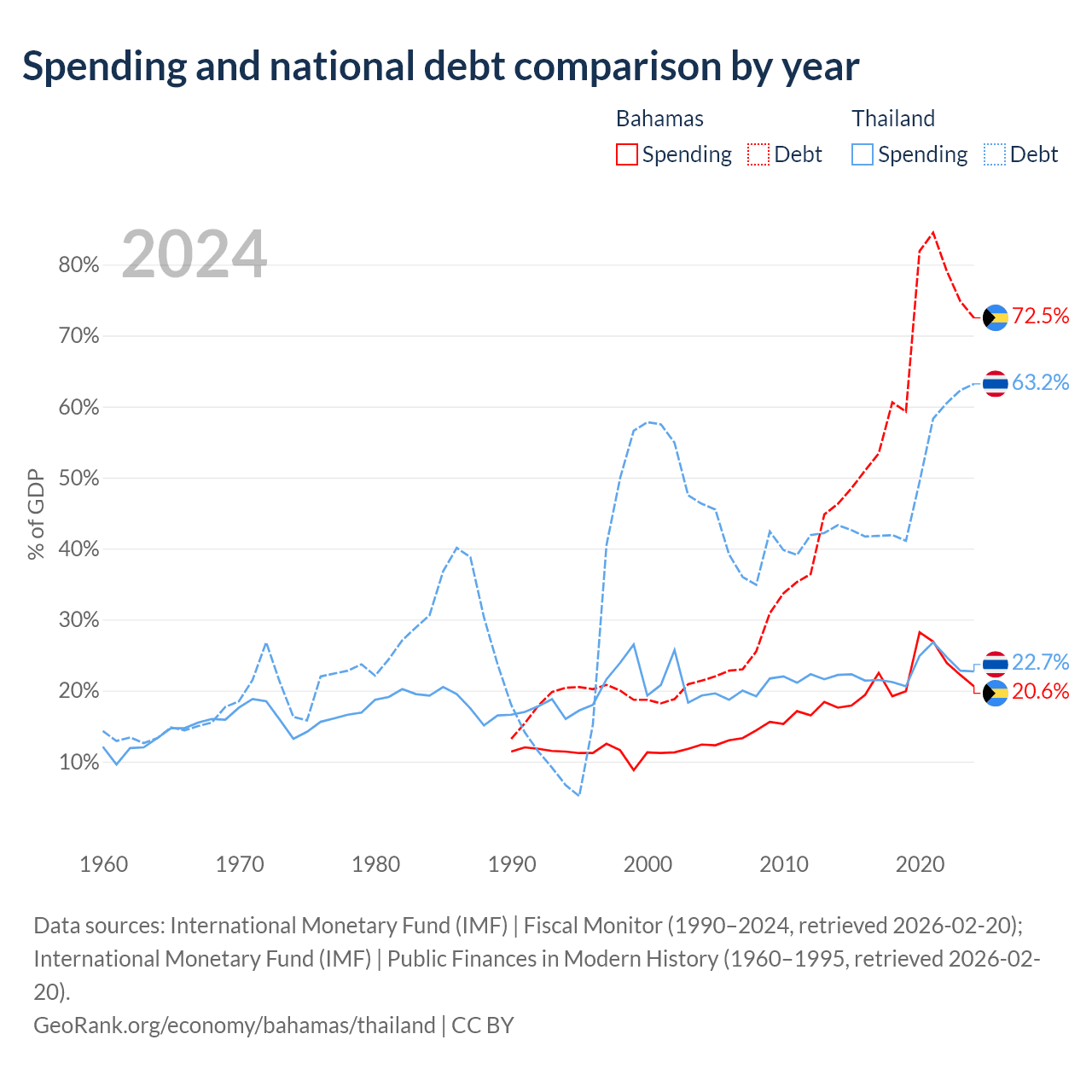 The Bahamas has $11.5B in government debt (72.5% of GDP), compared to $333B (63.2% of GDP) in Thailand.