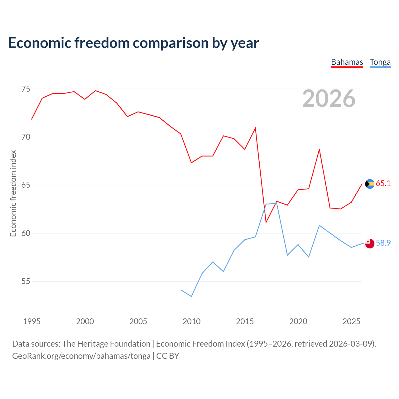 The Economic Freedom Index for the Bahamas is 65.1, ranking 66/197, compared to 58.9 for Tonga, ranking 107/197. The chart above displays a comparison of annual changes in economic freedom indexes.