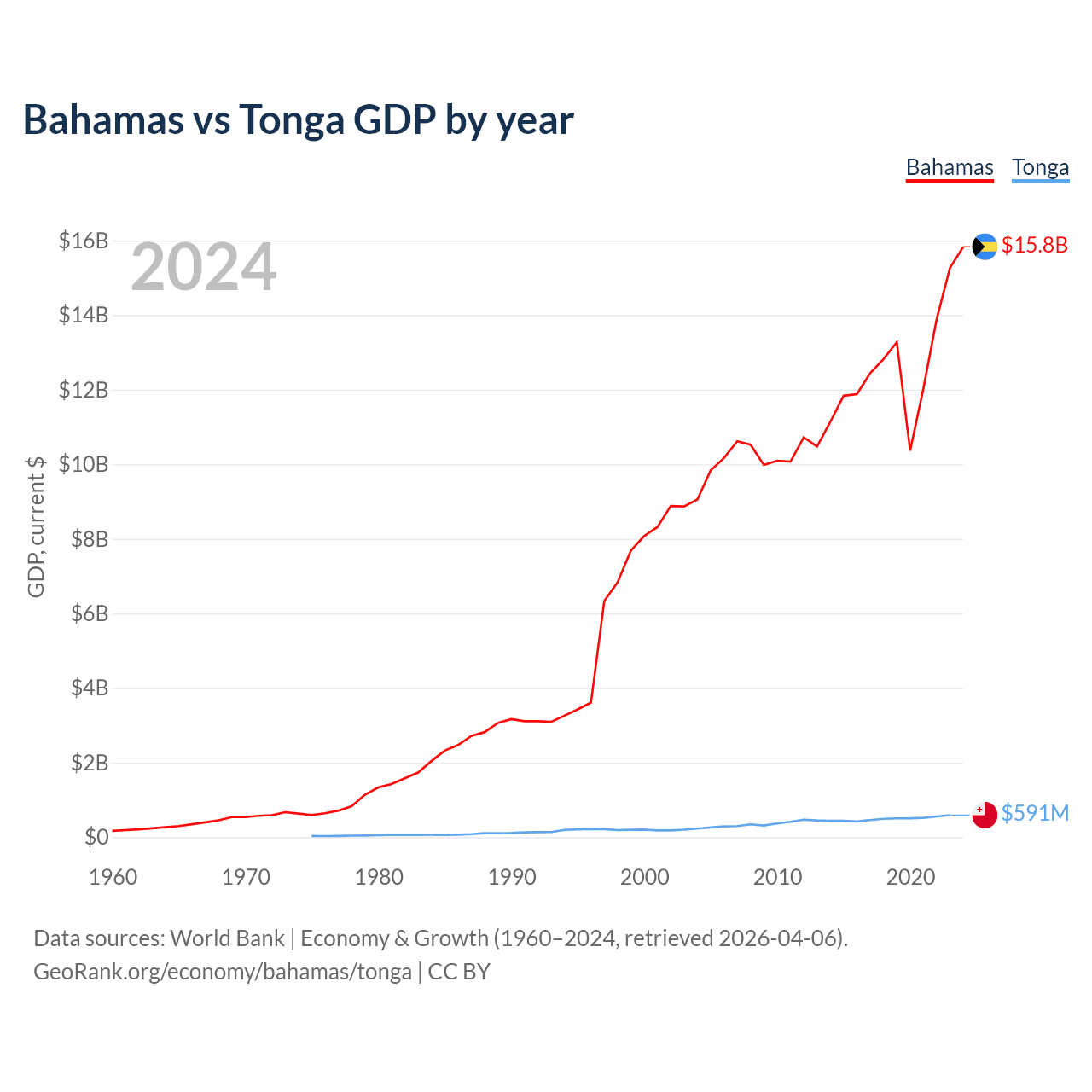 The Bahamas has a GDP of $15.8B compared to $591M for Tonga, ranking 140/197 and 191/197 by economy size, respectively.