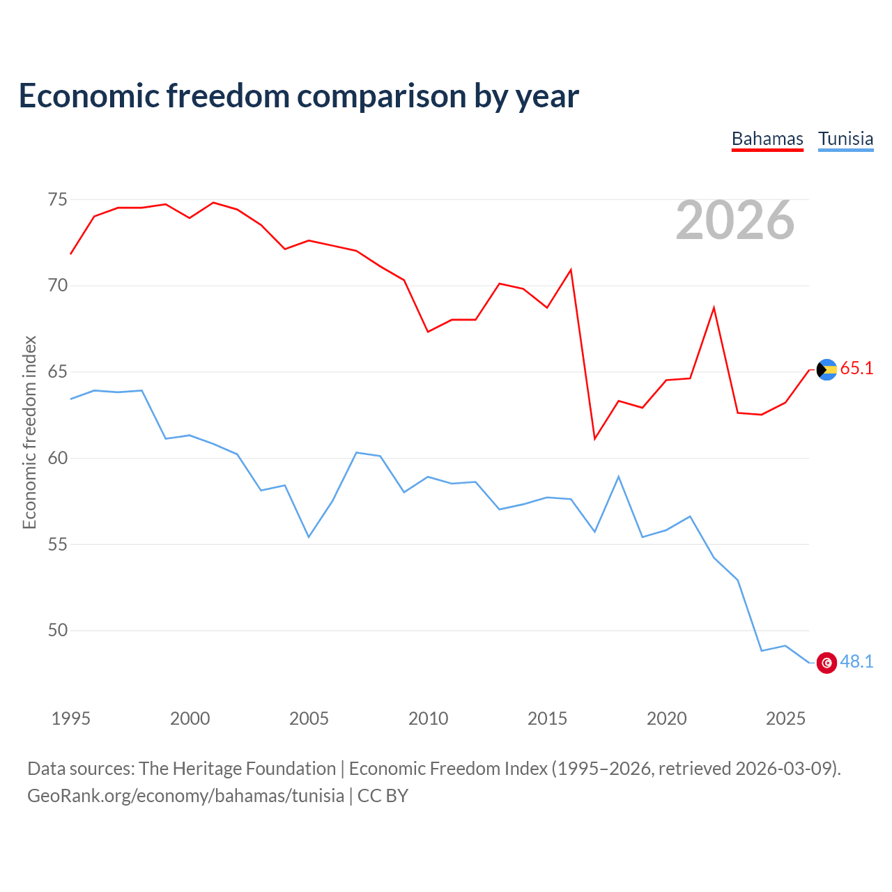 The Economic Freedom Index for the Bahamas is 65.1, ranking 66/197, compared to 48.1 for Tunisia, ranking 172/197. The chart above displays a comparison of annual changes in economic freedom indexes.