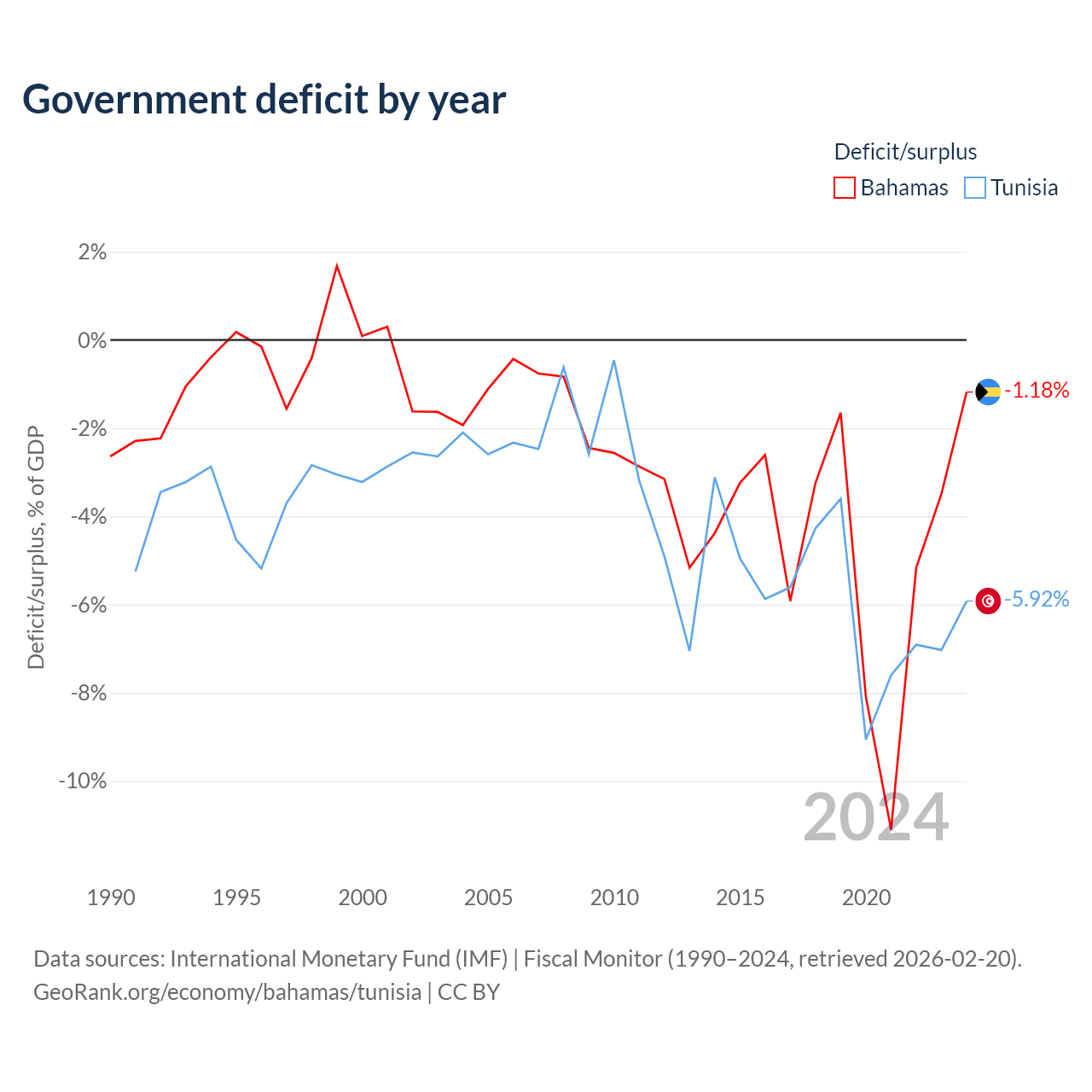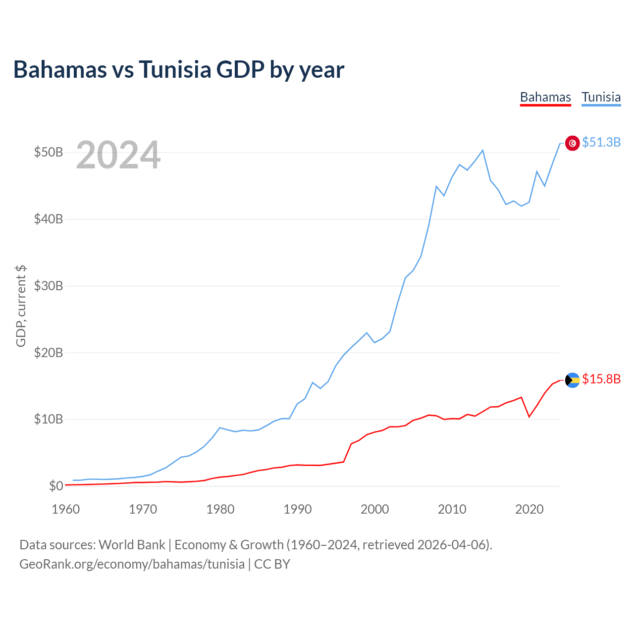 The Bahamas has a GDP of $15.8B compared to $51.3B for Tunisia, ranking 140/197 and 93/197 by economy size, respectively.