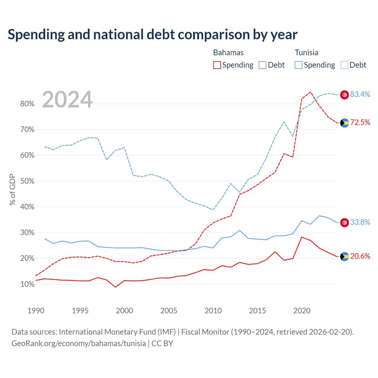 The Bahamas has $11.5B in government debt (72.5% of GDP), compared to $42.8B (83.4% of GDP) in Tunisia.