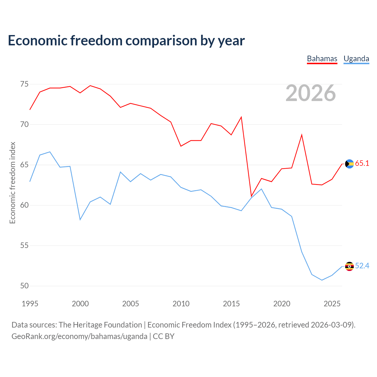 The Economic Freedom Index for the Bahamas is 65.1, ranking 66/197, compared to 52.4 for Uganda, ranking 149/197. The chart above displays a comparison of annual changes in economic freedom indexes.