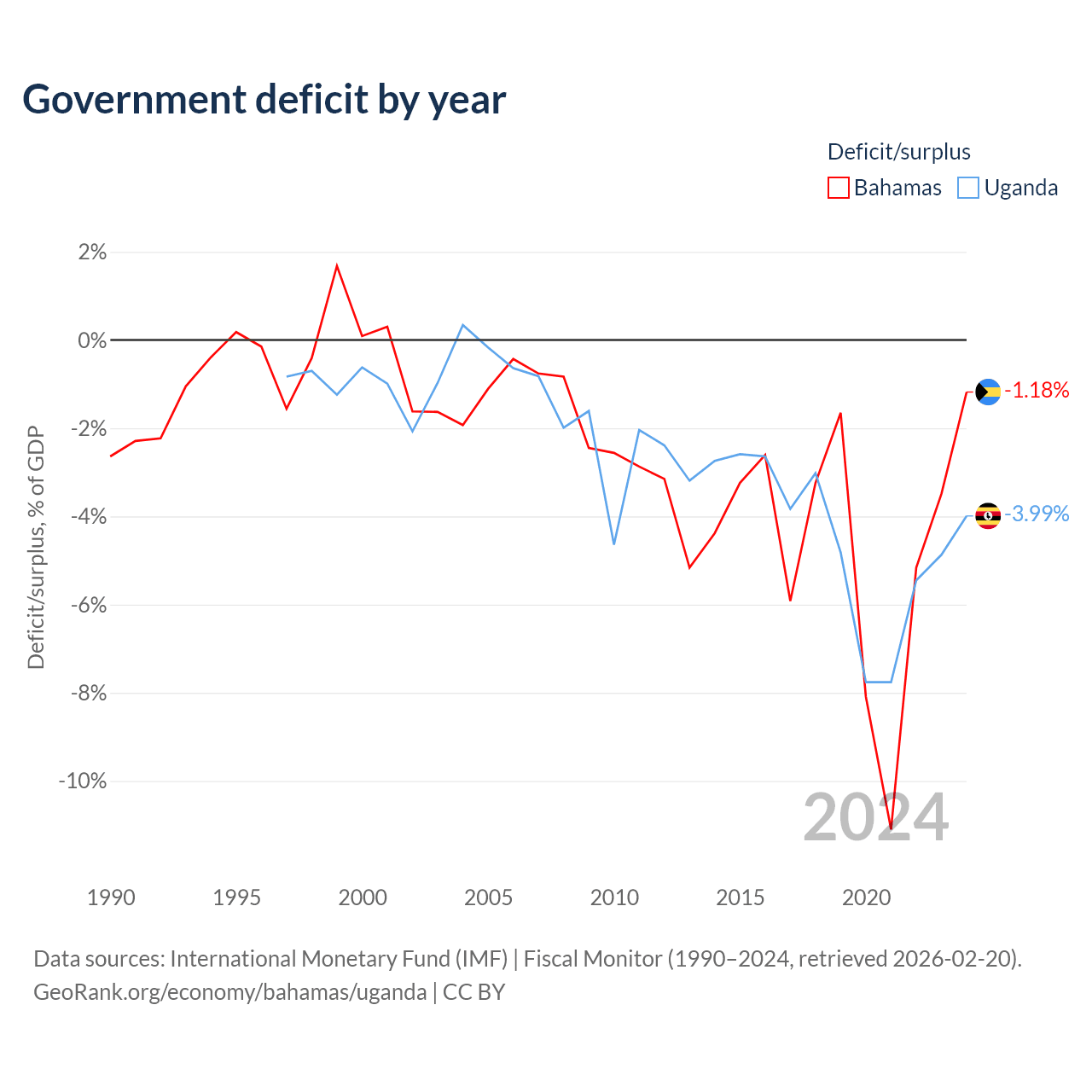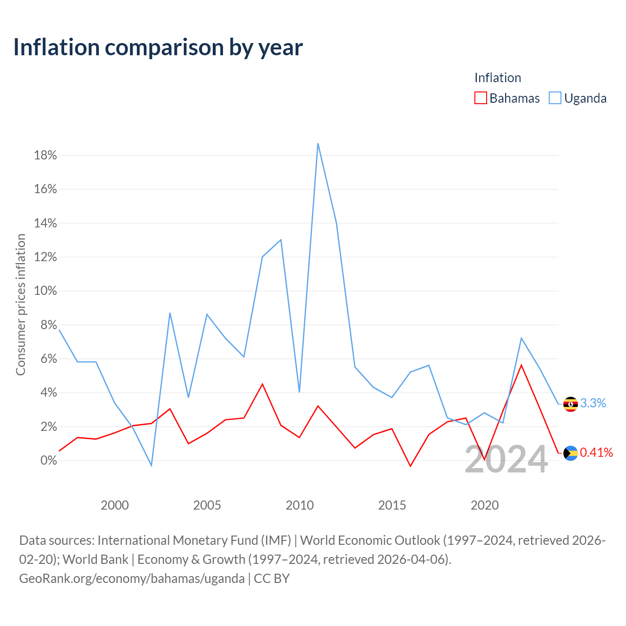 The Bahamas has a GDP of $15.8B compared to $53.9B for Uganda, ranking 140/197 and 89/197 by economy size, respectively.
