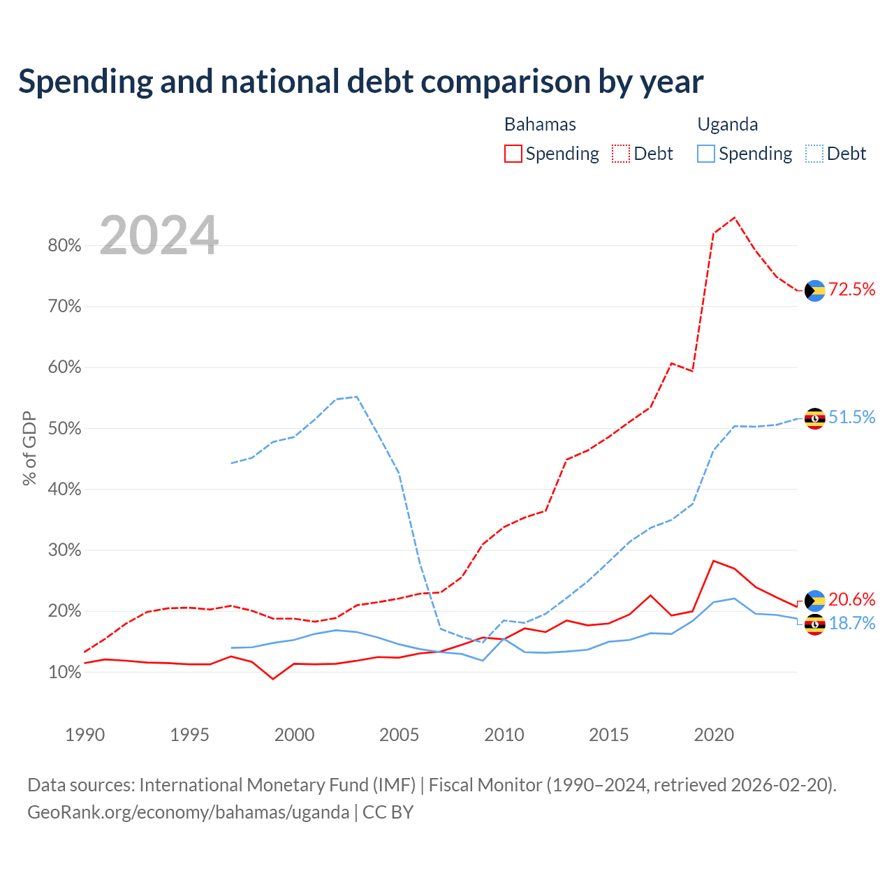 The Bahamas has $11.5B in government debt (72.5% of GDP), compared to $27.8B (51.5% of GDP) in Uganda.