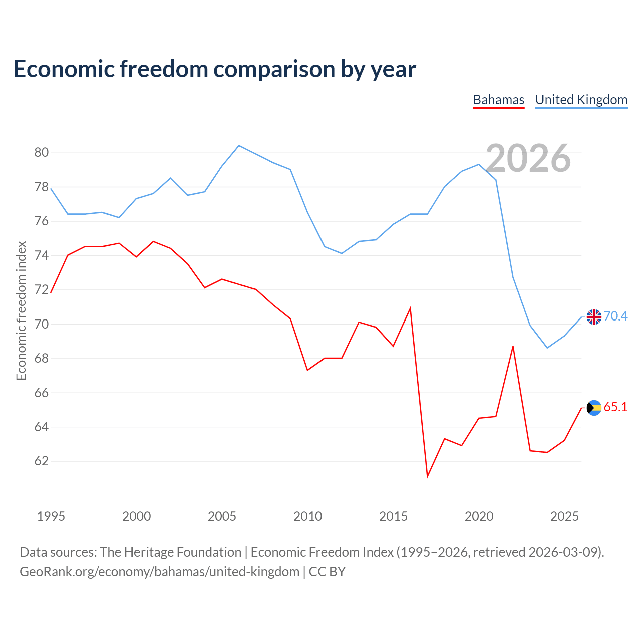 The Economic Freedom Index for the Bahamas is 65.1, ranking 66/197, compared to 70.4 for the United Kingdom, ranking 35/197. The chart above displays a comparison of annual changes in economic freedom indexes.