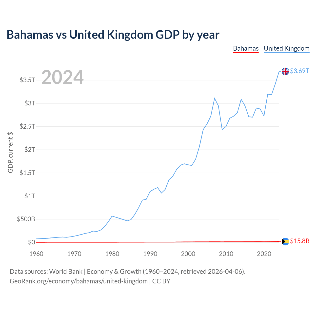 The Bahamas has a GDP of $15.8B compared to $3.69T for the United Kingdom, ranking 140/197 and 6/197 by economy size, respectively.