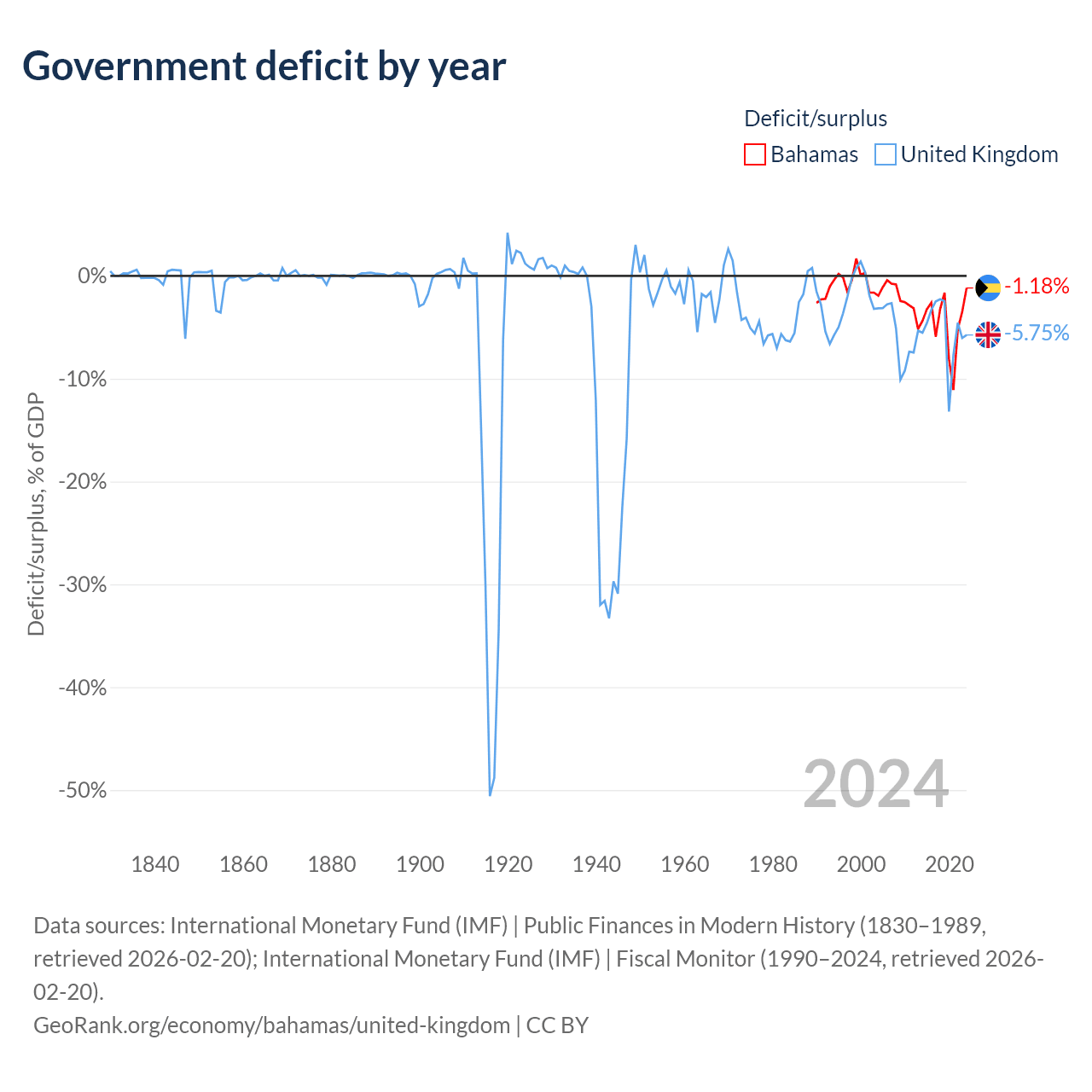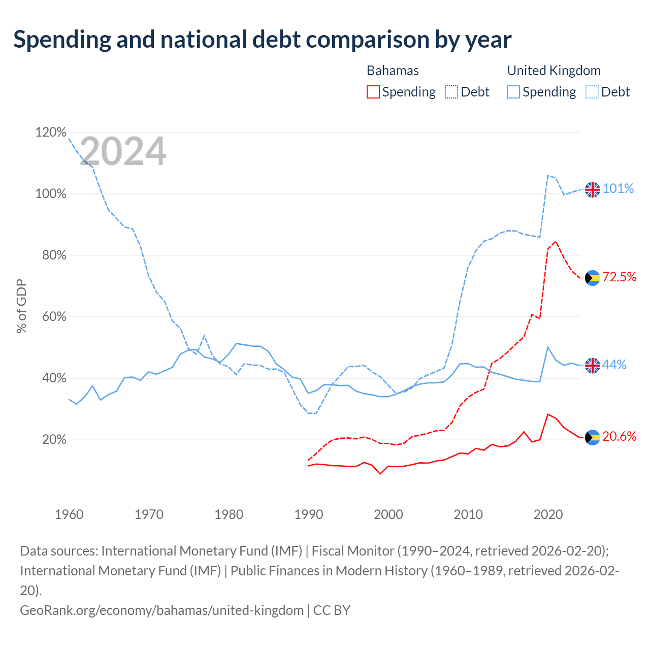 The Bahamas has $11.5B in government debt (72.5% of GDP), compared to $3.73T (101.2% of GDP) in the United Kingdom.