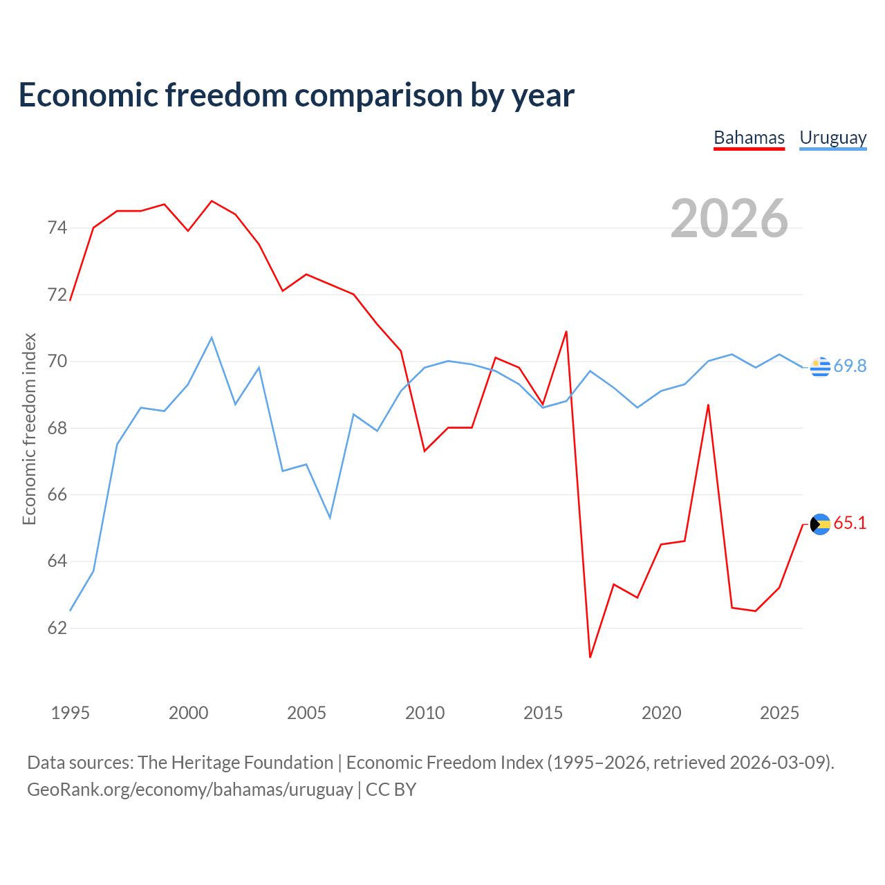 The Economic Freedom Index for the Bahamas is 65.1, ranking 66/197, compared to 69.8 for Uruguay, ranking 39/197. The chart above displays a comparison of annual changes in economic freedom indexes.
