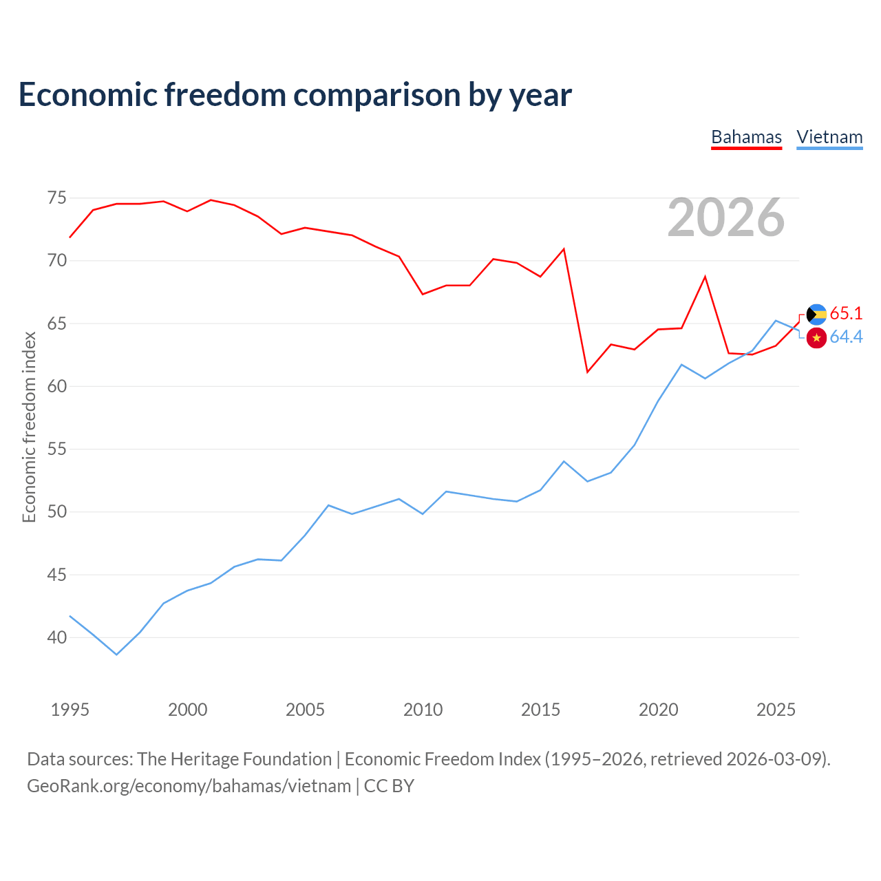 The Economic Freedom Index for the Bahamas is 65.1, ranking 66/197, compared to 64.4 for Vietnam, ranking 73/197. The chart above displays a comparison of annual changes in economic freedom indexes.