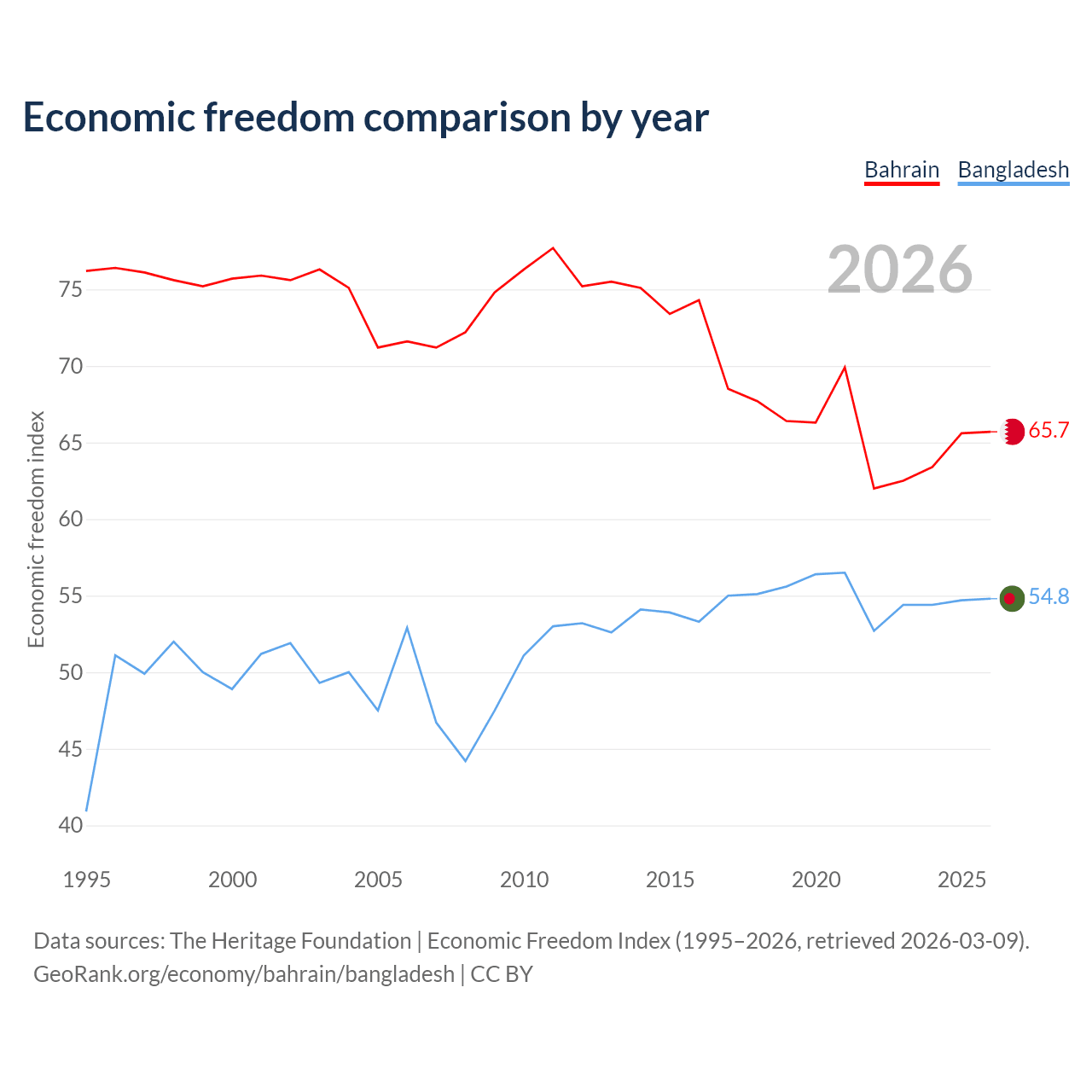 The Economic Freedom Index for Bahrain is 65.7, ranking 63/197, compared to 54.8 for Bangladesh, ranking 131/197. The chart above displays a comparison of annual changes in economic freedom indexes.