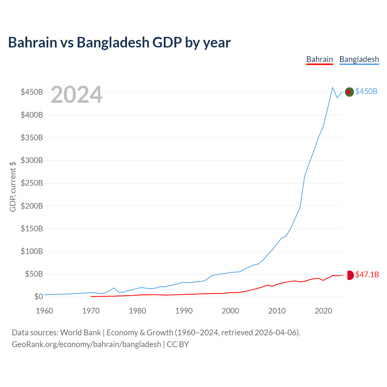 Bahrain has a GDP of $47.1B compared to $450B for Bangladesh, ranking 96/197 and 36/197 by economy size, respectively.