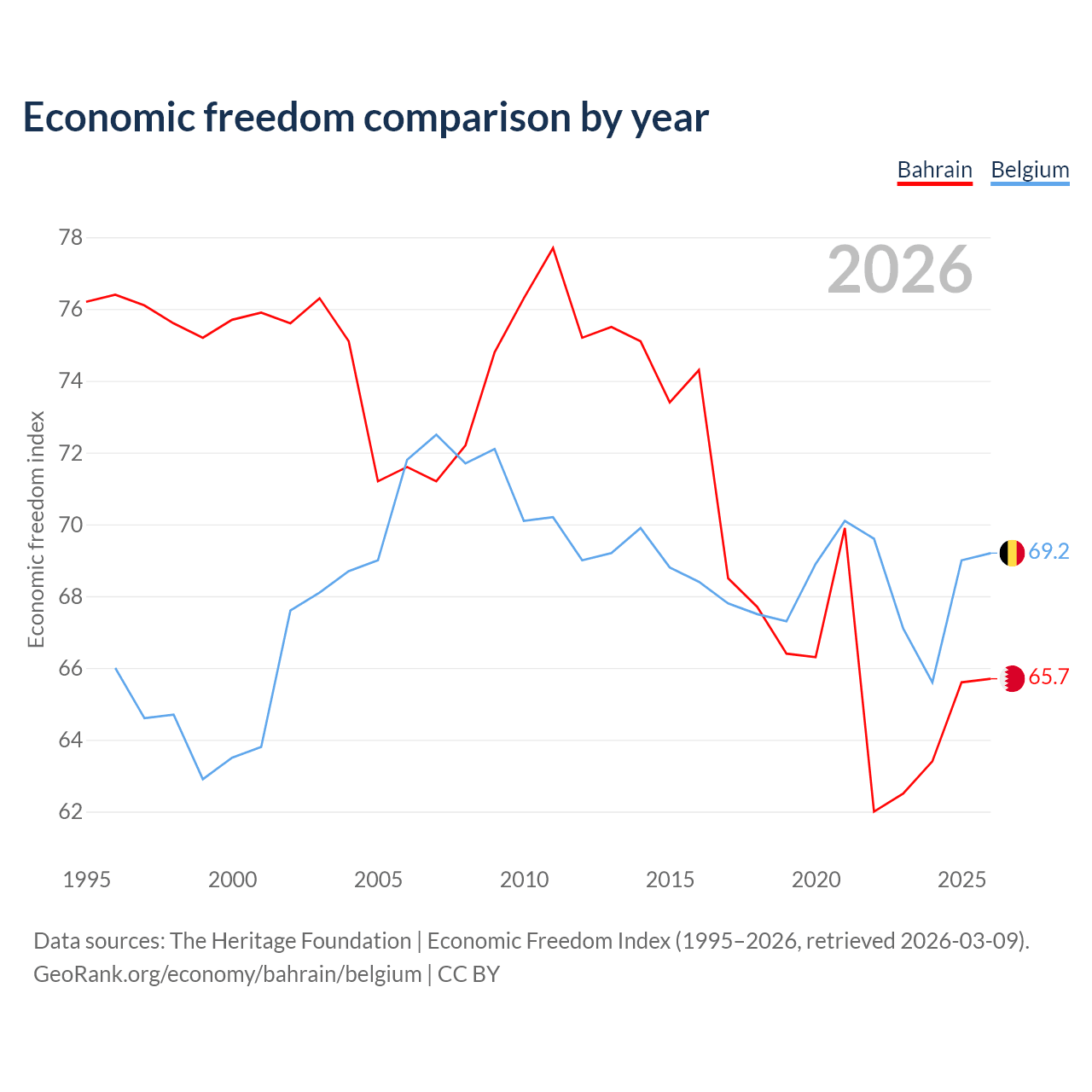 The Economic Freedom Index for Bahrain is 65.7, ranking 63/197, compared to 69.2 for Belgium, ranking 42/197. The chart above displays a comparison of annual changes in economic freedom indexes.