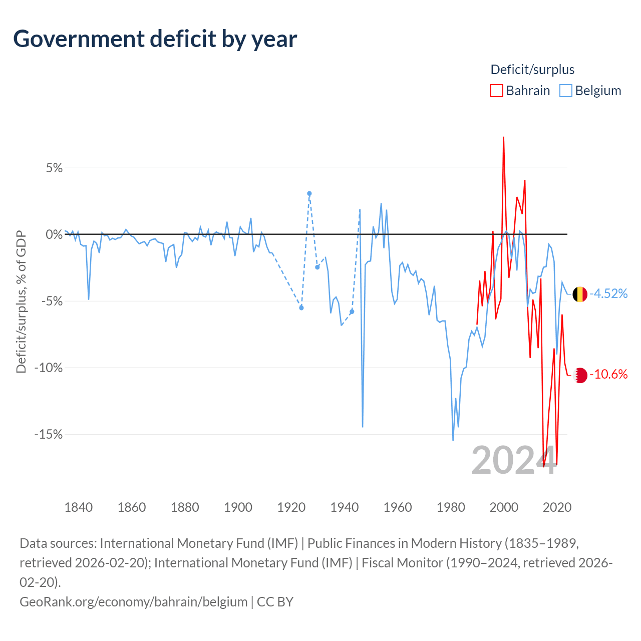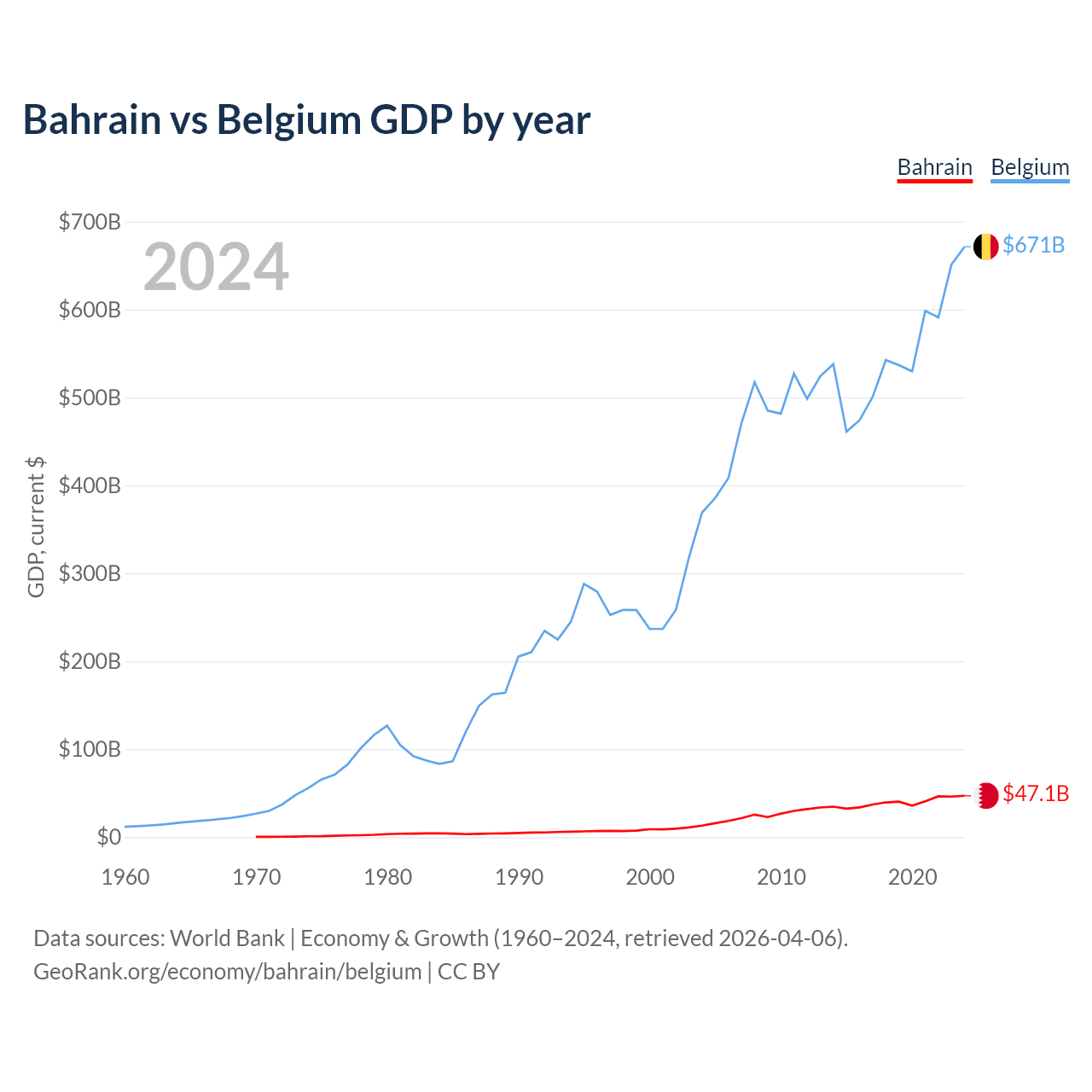 Bahrain has a GDP of $47.1B compared to $671B for Belgium, ranking 96/197 and 23/197 by economy size, respectively.