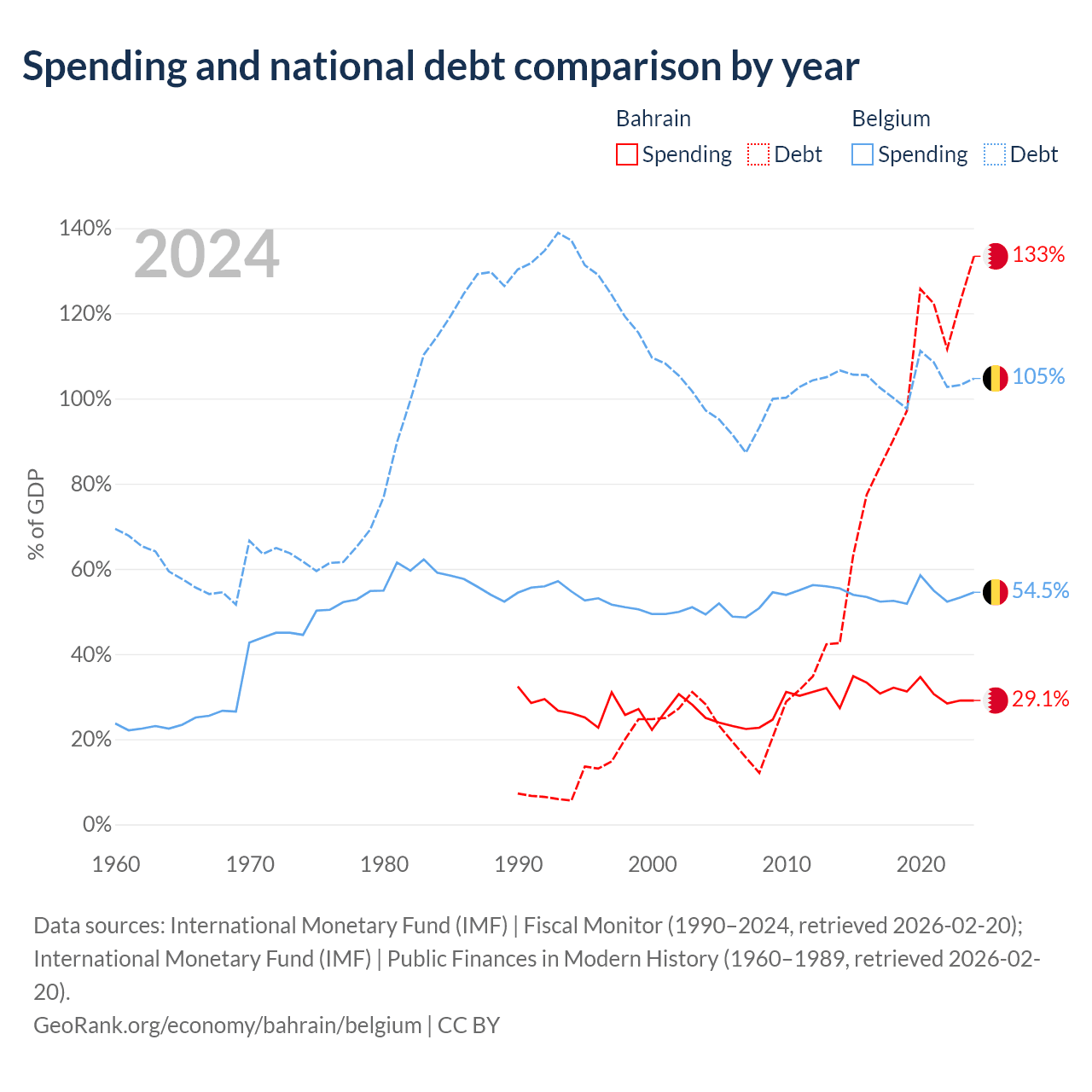 Bahrain has $62.8B in government debt (133.4% of GDP), compared to $703B (104.7% of GDP) in Belgium.