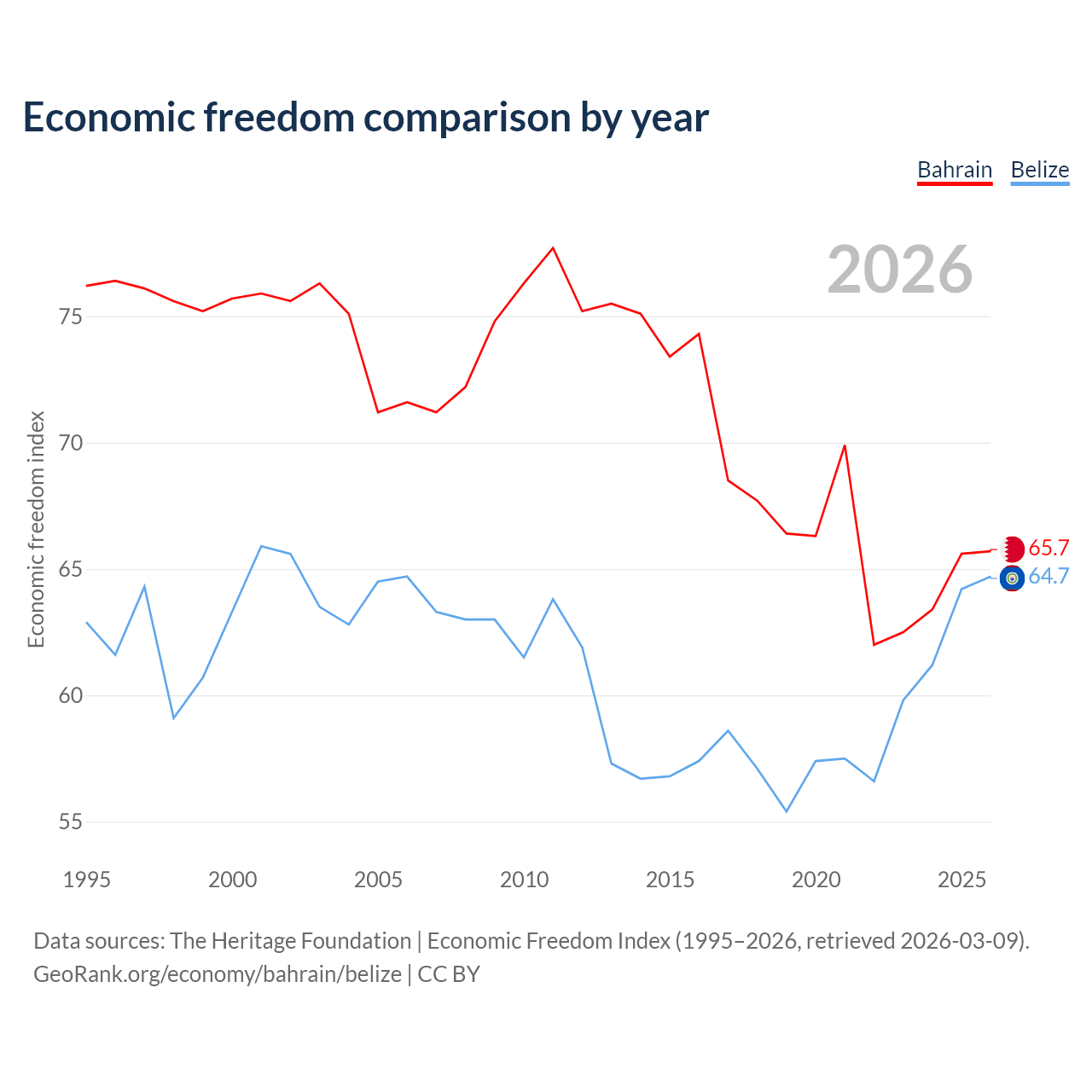 The Economic Freedom Index for Bahrain is 65.7, ranking 63/197, compared to 64.7 for Belize, ranking 71/197. The chart above displays a comparison of annual changes in economic freedom indexes.