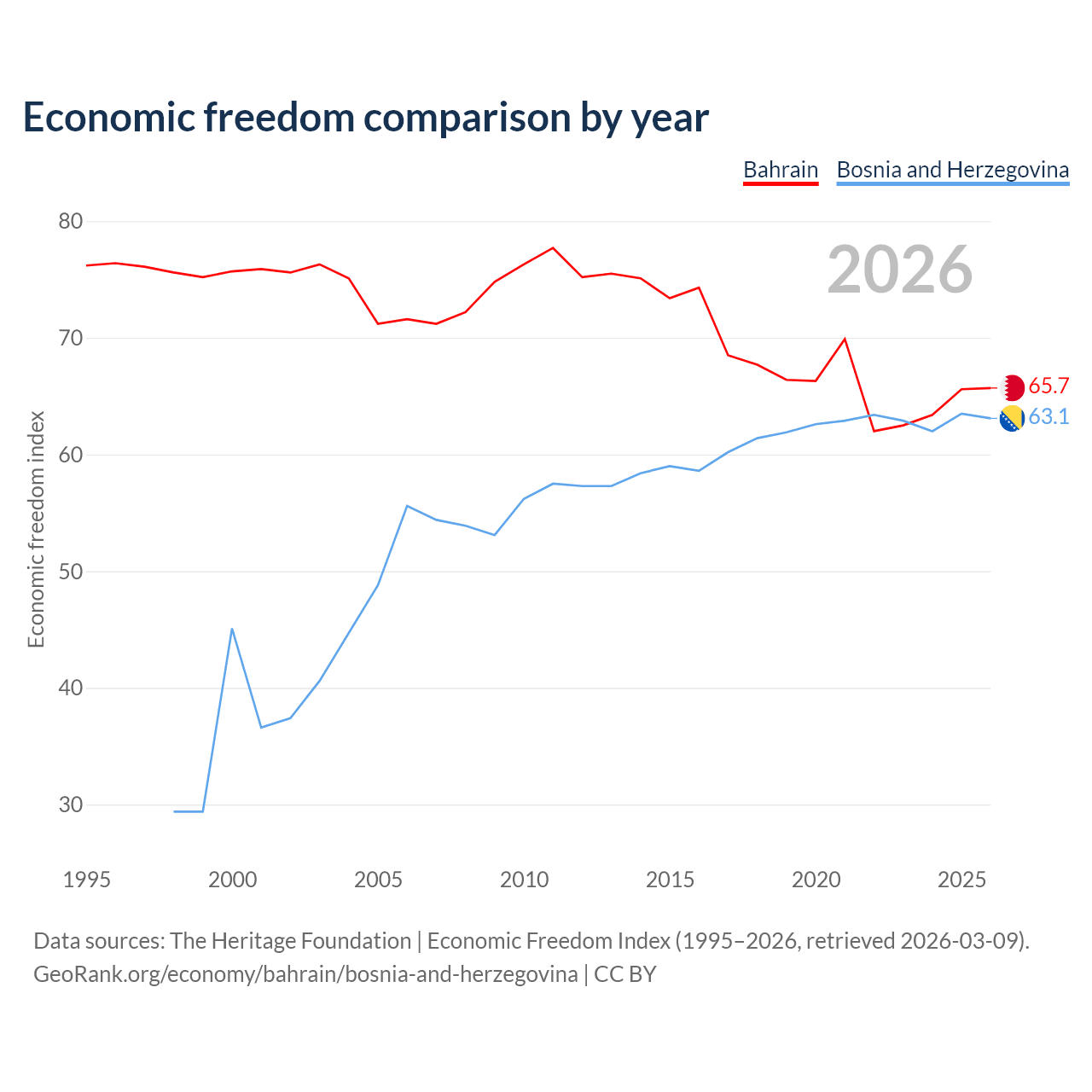 The Economic Freedom Index for Bahrain is 65.7, ranking 63/197, compared to 63.1 for Bosnia and Herzegovina, ranking 83/197. The chart above displays a comparison of annual changes in economic freedom indexes.