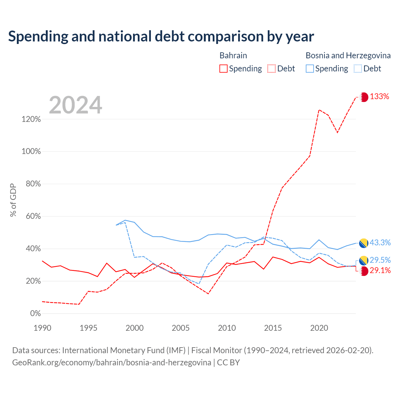 Bahrain has $62.8B in government debt (133.4% of GDP), compared to $8.74B (29.5% of GDP) in Bosnia and Herzegovina.