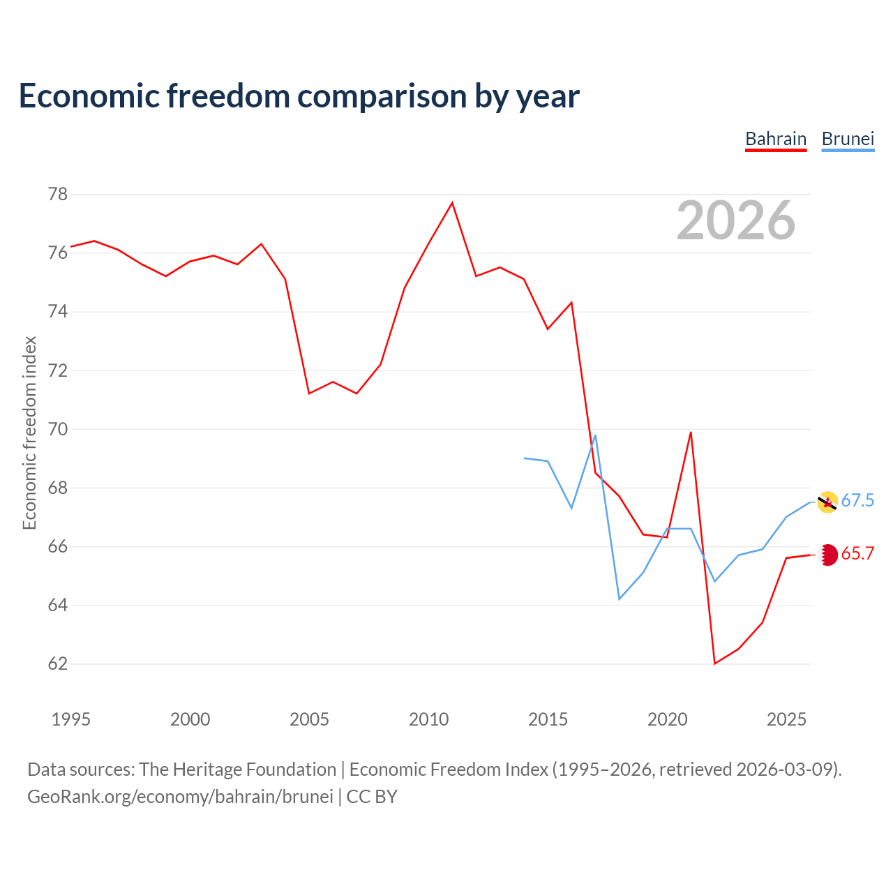 The Economic Freedom Index for Bahrain is 65.7, ranking 63/197, compared to 67.5 for Brunei, ranking 55/197. The chart above displays a comparison of annual changes in economic freedom indexes.