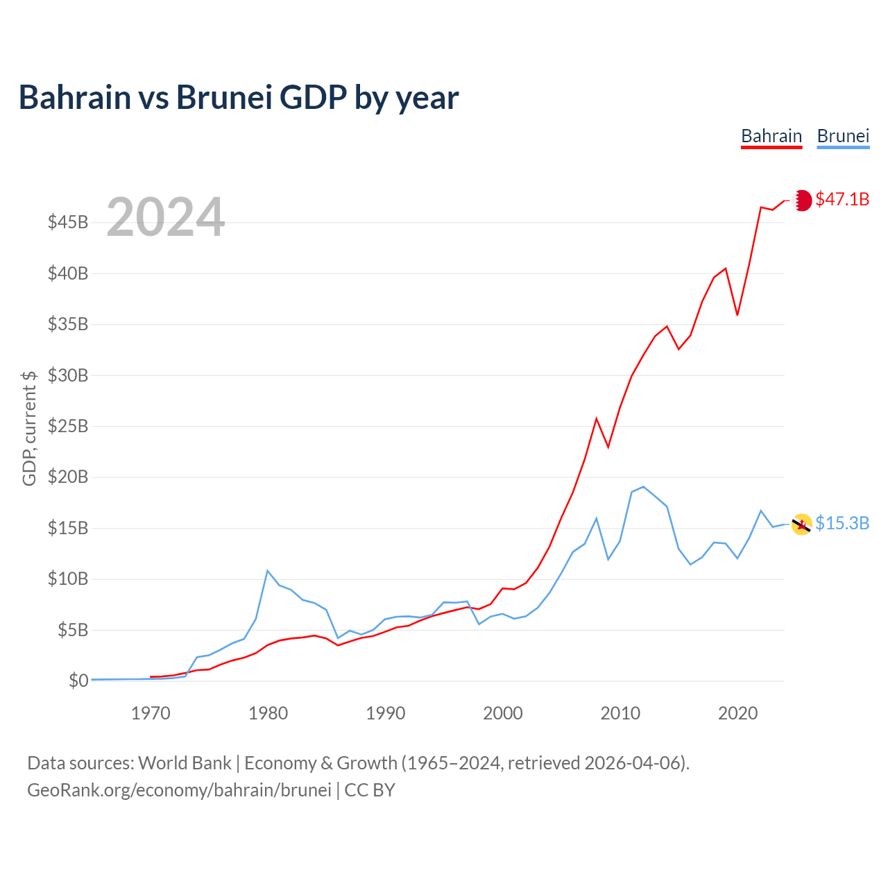 Bahrain has a GDP of $47.1B compared to $15.3B for Brunei, ranking 96/197 and 142/197 by economy size, respectively.