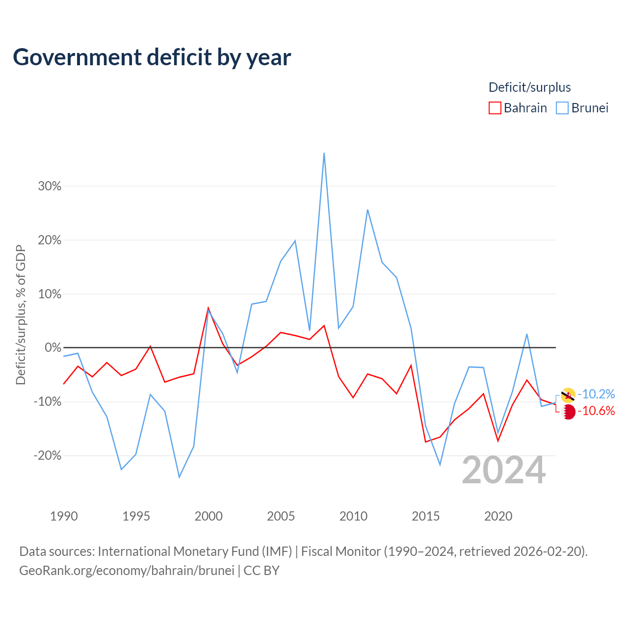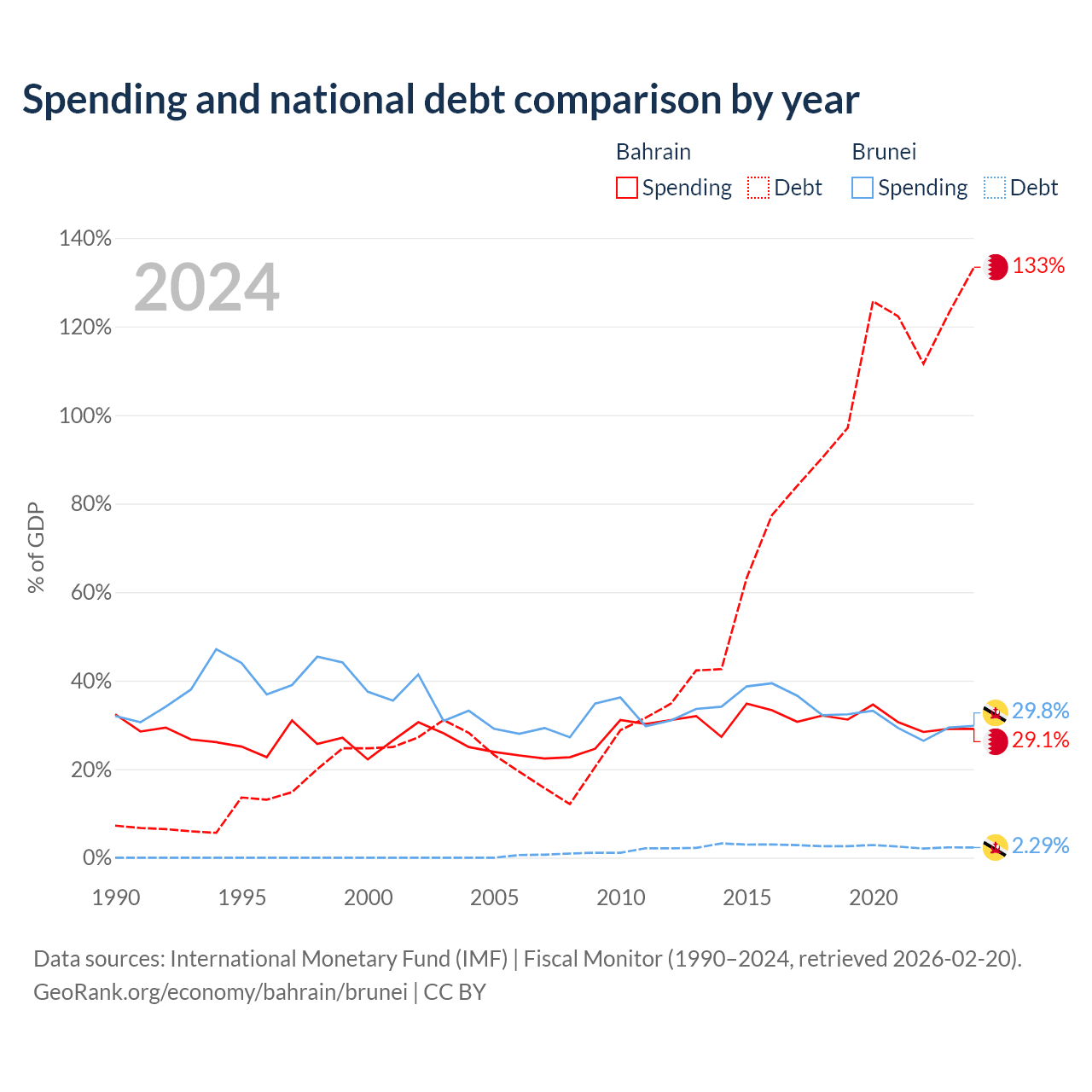 Bahrain has $62.8B in government debt (133.4% of GDP), compared to $351M (2.29% of GDP) in Brunei.