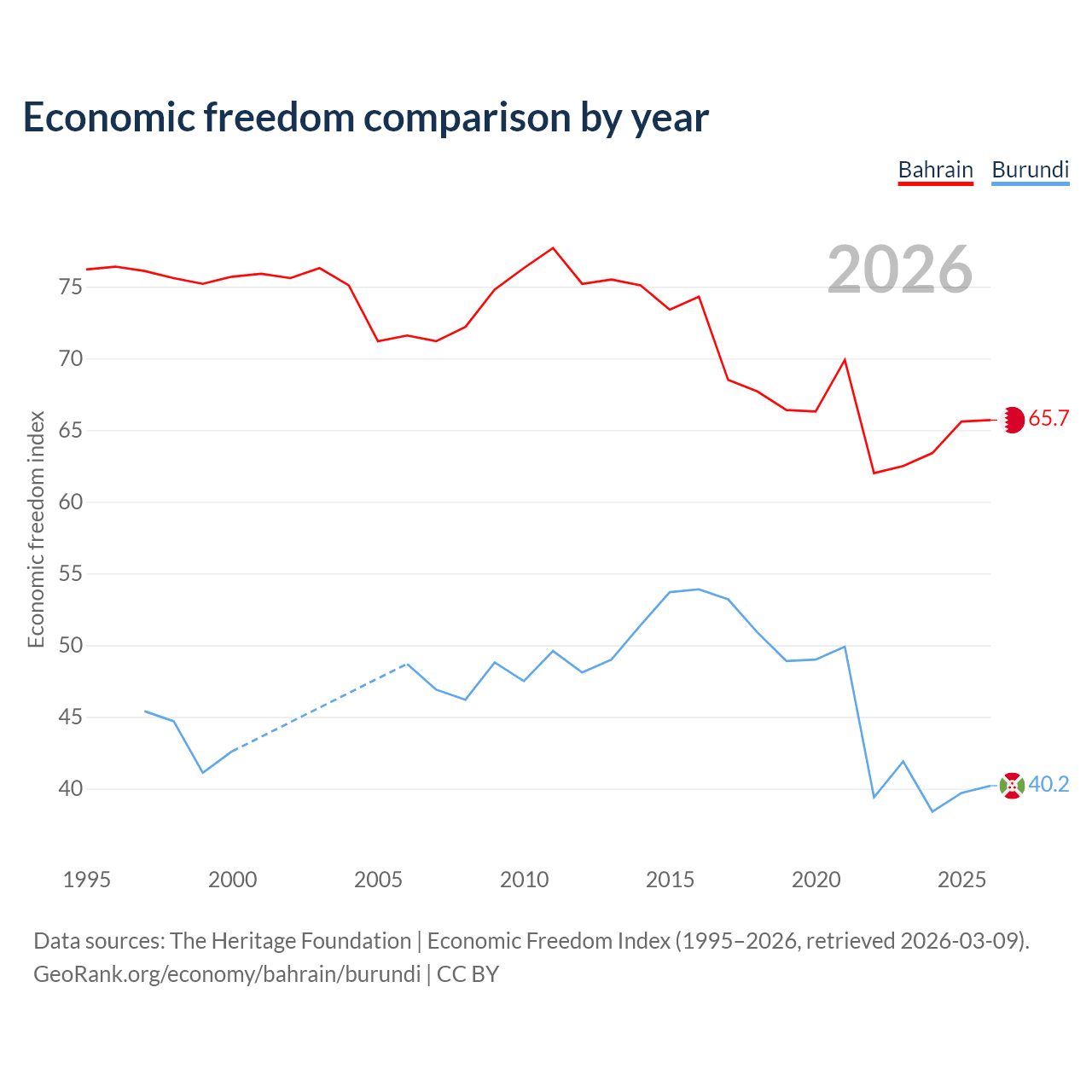 The Economic Freedom Index for Bahrain is 65.7, ranking 63/197, compared to 40.2 for Burundi, ranking 187/197. The chart above displays a comparison of annual changes in economic freedom indexes.