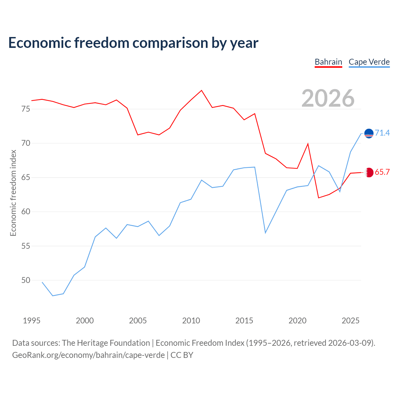 The Economic Freedom Index for Bahrain is 65.7, ranking 63/197, compared to 71.4 for Cape Verde, ranking 32/197. The chart above displays a comparison of annual changes in economic freedom indexes.